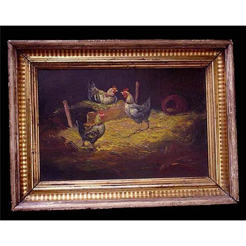 Charming oil painting on board of roosters and a hen inside a barn. Comes in an elegant, old gilt wood frame and is unsigned. Closely resembles the style of the painter of Italian ancestry who painted in South America, Aristodemo Latanzi. It is marked in pencil 1935 on the reverse side of the board. In good used condition, as shown. Please ask questions, request photos and shipping costs prior to bidding.