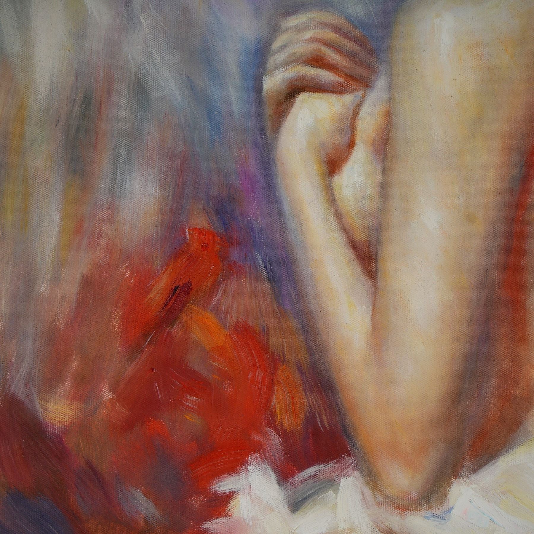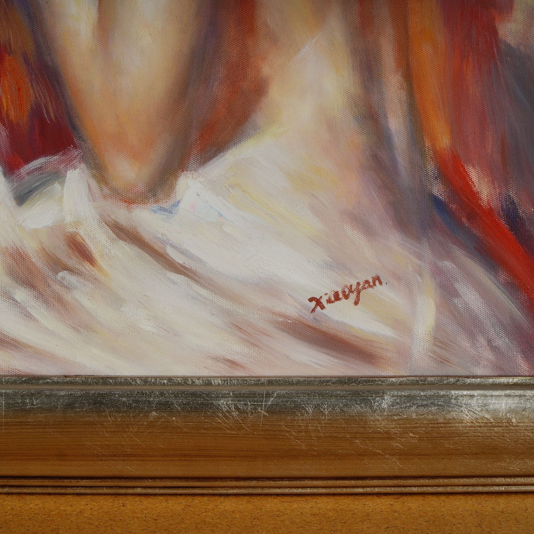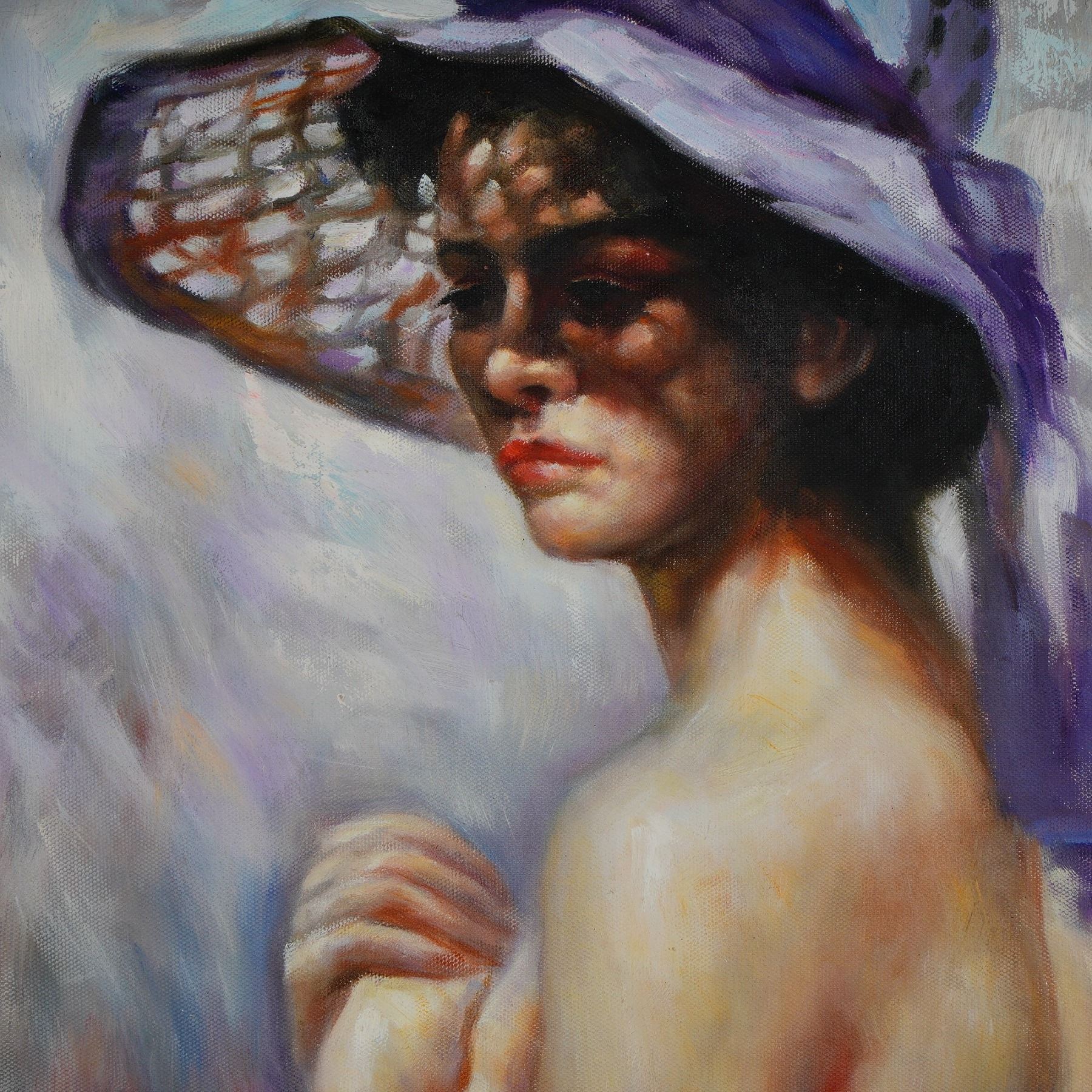 Vibrant and expressive oil painting signed Xiaoyan, after the original work by Italian painter Pino Daeni titled Lady in Spring Bonnet. The composition captures a graceful seated woman, partially draped in white, with a purple bonnet casting dramatic shadows across her face, executed with bold, impressionistic brushstrokes in vivid tones of red, violet, and cream. Pino Daeni, celebrated for his romantic and luminous depictions of women, rose to international prominence as a painter and illustrator, drawing influence from the Pre-Raphaelites and French Impressionists. His works are treasured for their emotional depth, painterly elegance, and timeless beauty, and they continue to captivate collectors worldwide. This interpretation after Pino Daeni conveys the same sense of warmth and allure, offering collectors a striking decorative work rooted in the legacy of one of the twentieth century's most beloved figurative painters. The verso bears the inscription Cavalieri. Signed lower right.