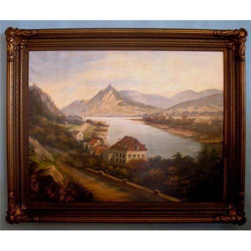 Here is an original oil painting on canvas by F. Gloede. The painting has a repair patch which is visible on the last picture. The subject is a hillside chateau overlooking the Rhine with mountain ranges beyond. It measures 28 inches tall by 36 inches wide.