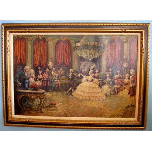 Here is an original oil painting on canvas by Lydia D. Fabing. The painting is in fine condition. The subject is a lovely French ballroom scene full of rich texture and color. The painting measures 24 inches tall by 36 inches wide.