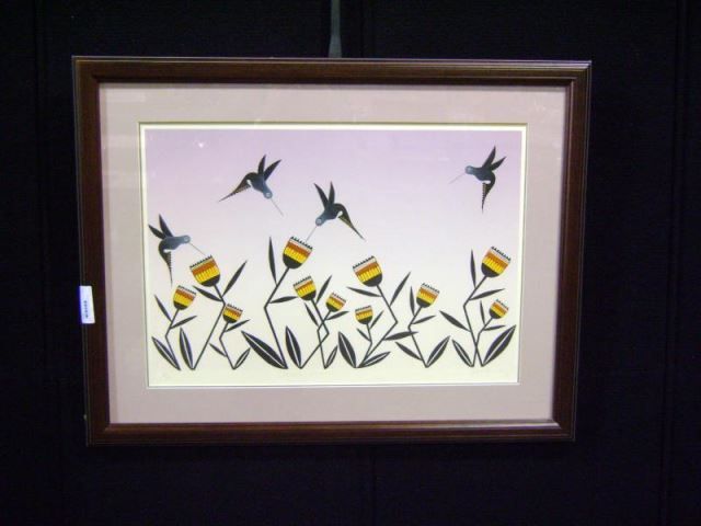 Oil Painting on Canvas of Hummingbirds-Maker Unknown-Stylized painting of Hummingbirds over Flowers-