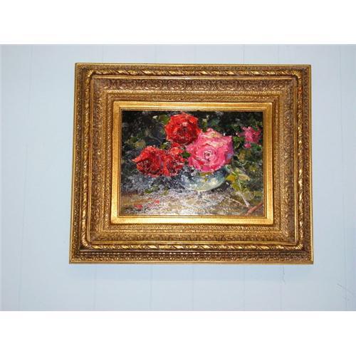 Brillant oil painting of red roses in a simple clear vase with petals falling to the ground mounted in a carved gold leaf wood frame. This very attractive painting adds color and life to any room.