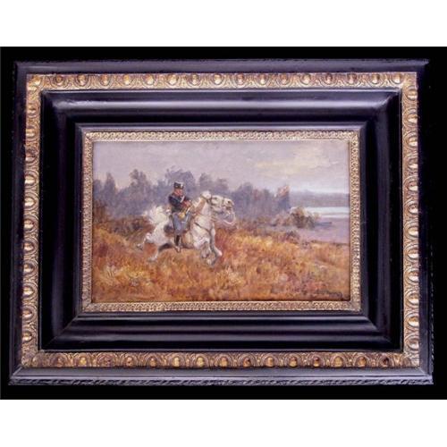 Oil painting on board of a 19th Century cavalry soldier galloping on a white horse. It is signed on the lower right Alessio Issupoff. Also known as Aleksej Vladimirovic Isupov (1889-1957), a Russian painter and graphic artist who studied at Moscow College of art, sculpture and architecture and moved to Italy in 1925 where he became a well-known and successful artist. He is known for his painting of horses, genre scenes and winter landscapes reminiscent of his native Russia. His works have sold for record prices in major auction houses such as Sothebys, Finarte and Christies. In good condition with minor imperfections. Reverse of board has another, half-finished painting. Please ask questions, request additional photos and shipping costs before buying.