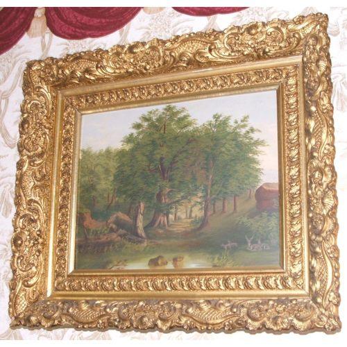 unsigned. American. Late 19th -20th century. Oil on artist board. A nice primitive landscape depicting a forest with several deer in front of a large rock. Framed in an elaborately carved gilt wood frame. 12" high X 19" wide