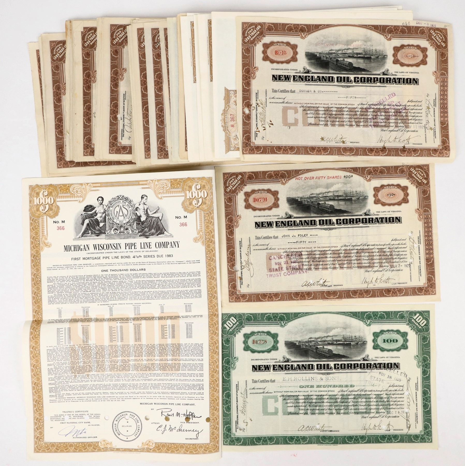 Oil Pipeline Related Stock Group. About 120 plus certs and bonds. Includes: Michigan Wisconsin Pipeline c.1960s and New England Oil c1920s.