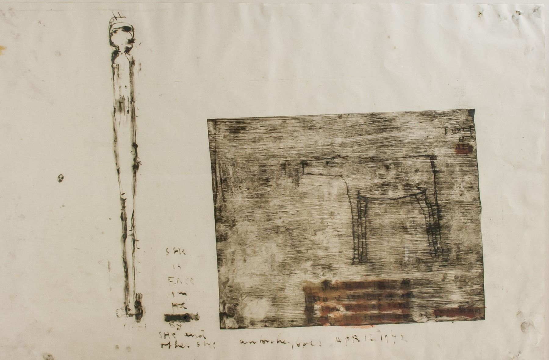 Unattributed oil stick monotype on paper, featuring figure and horse, untitled. Executed 1972. 25.25 x 39 inch (64 x 99 cm). Matted and in gilt wood frame. Water damage and foxing throughout. PROVENANCE: The Arwin Galleries, Detroit, Michigan, United States; thence by descent.