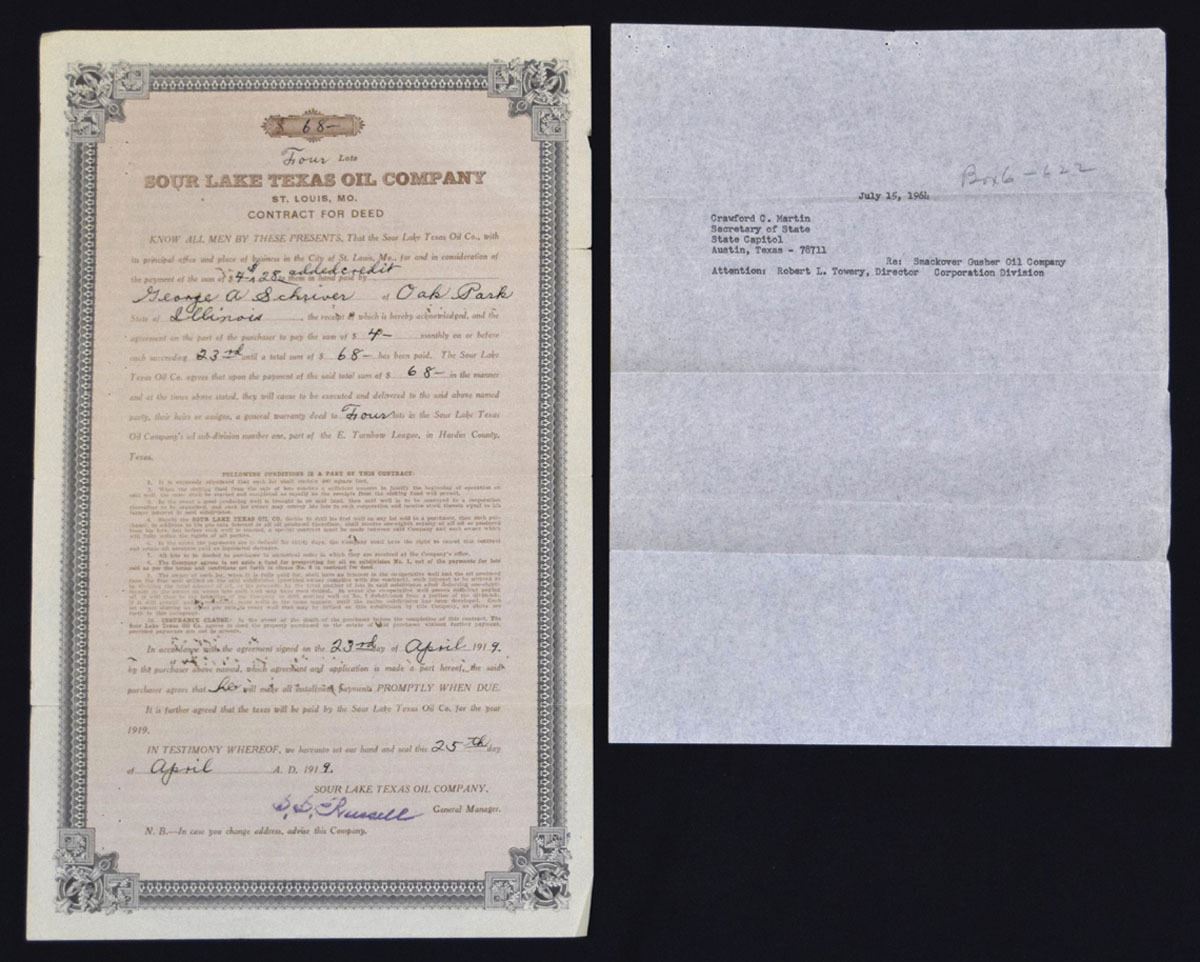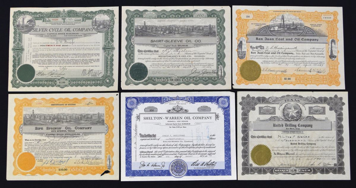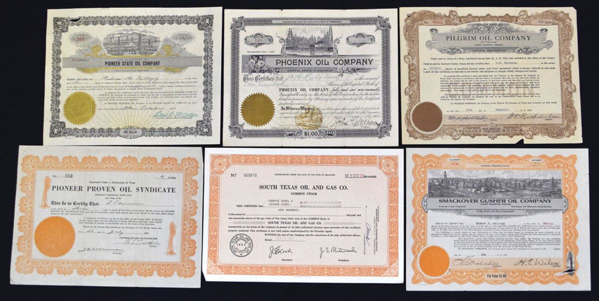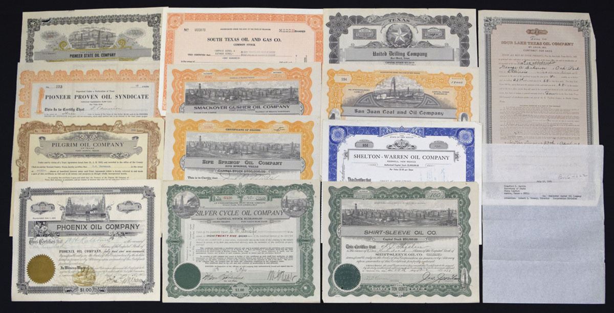 Various States, ca. 1910s–1960s. Lot of 14 I/U and I/C stock certificates from oil and gas companies, with two related documents (Sour Lake Texas Oil Co. contract for deed and a 1960 Texas corporate letter). Highlights include: Pioneer State Oil Company; Phoenix Oil Company; Pilgrim Oil Company (TX); Pioneer Proven Oil Syndicate; South Texas Oil & Gas Co.; Smackover Gusher Oil Company; Silver Cycle Oil Company; Shirt-Sleeve Oil Co.; San Juan Coal & Oil Company; Sipe Springs Oil Company; Shelton-Warren Oil Company; and United Drilling Company of Texas. Certificates display colorful borders in orange, green, blue, gray, and brown with oil-field/derrick vignettes and embossed seals. Condition generally VF to XF with folds, punch and ink cancellations, and minor edge wear. (14). Sold “AS IS” no returns accepted.