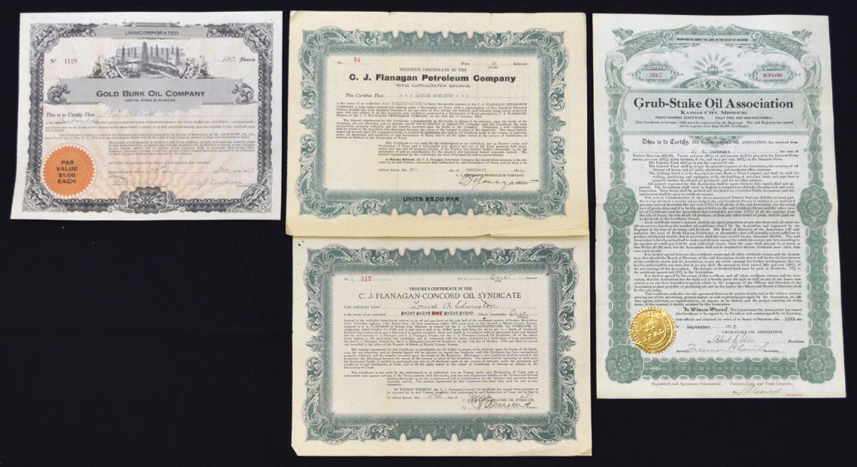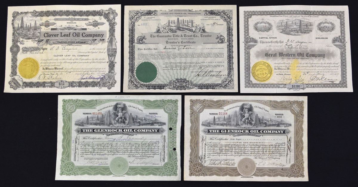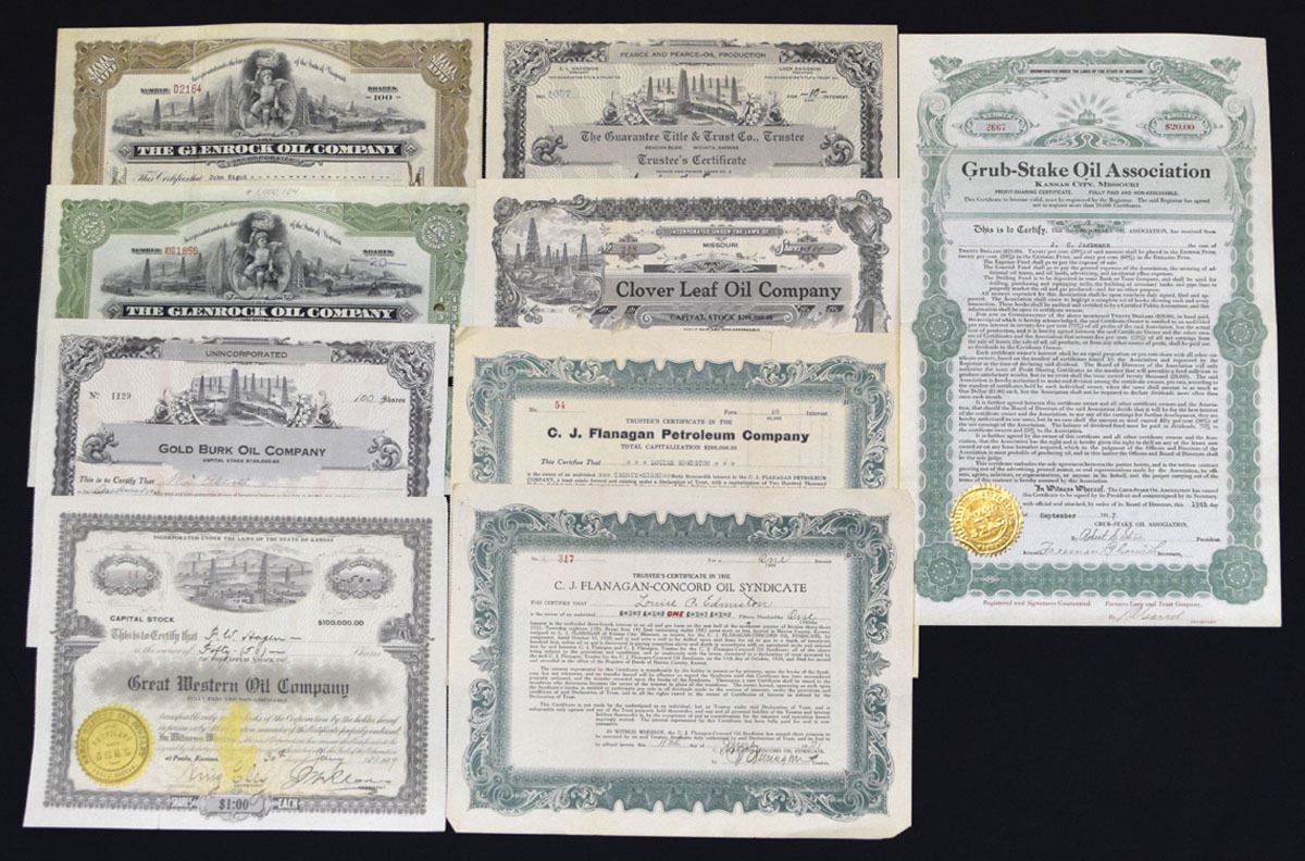 Various States, ca. 1910-30s. Lot of 9 stock certificates and trustee certificates from various oil companies and associations. Highlights include: The Glenrock Oil Company; Gold Burk Oil Company; Clover Leaf Oil Company; C. J. Flanagan Petroleum Company; C. J. Flanagan–Concord Oil Syndicate; Great Western Oil Company; Grub-Stake Oil Association; and The Guarantee Title & Trust Co., Trustee for Pearce and Pearce–Oil Production. Condition ranges VF to XF with some folds, minor handling, and light edge wear. (9). Sold “AS IS” no returns accepted.