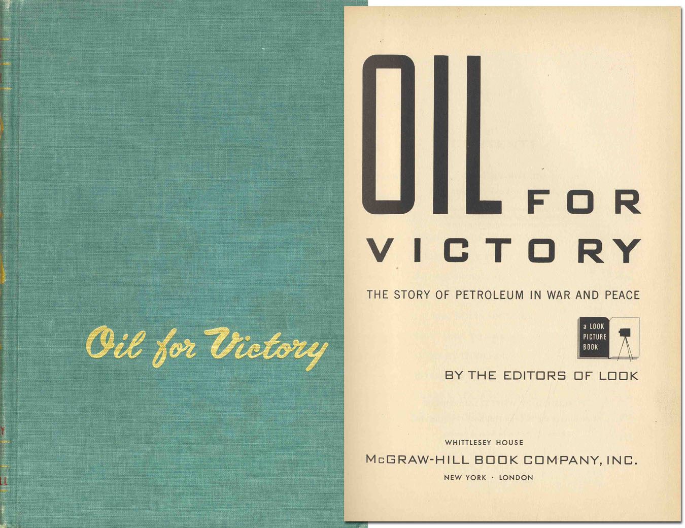 ''Oil for Victory: The Story of Petroleum in War and Peace'' by the editors of LOOK. New York: Whittlesey House: 1946. Green clothbound octavo runs 287pp. and contains many black and white photographs throughout. Slight edgewear, previous owner's pen to front flyleaf, otherwise in near fine condition.
