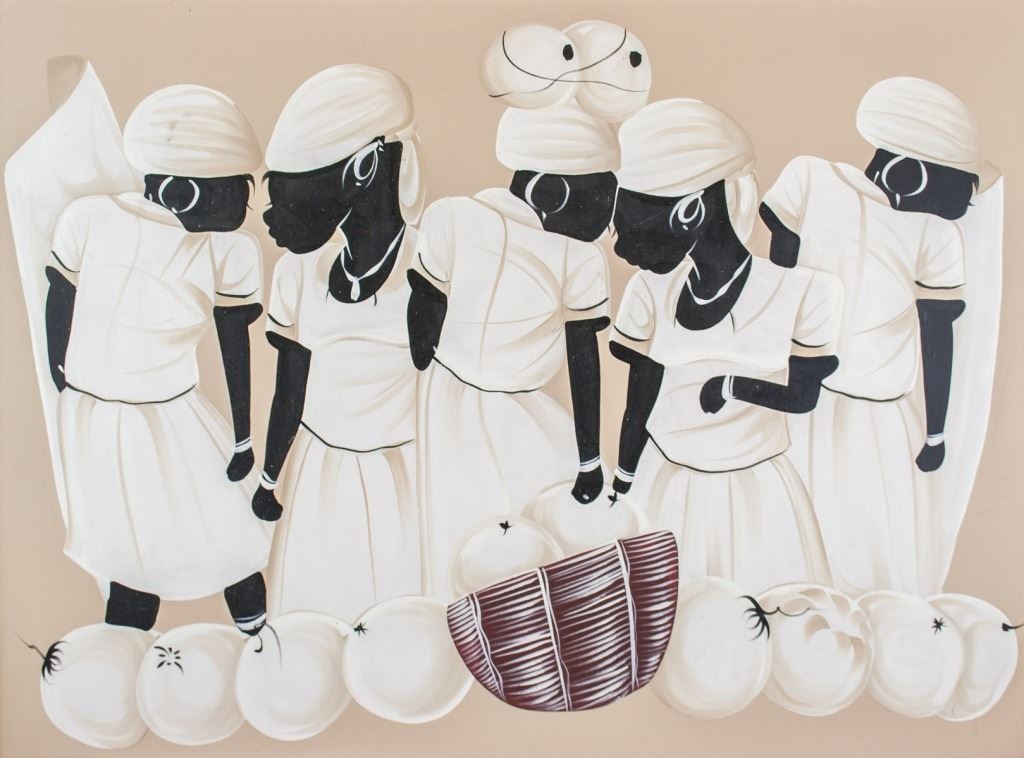Oil on board, framed. Featuring five dark-skinned figures in white clothes and a wicker basket. Board size: 72 x 98 cm (28.5 x 38.5 inches). Frame size: 81 x 107 cm (32 x 42 inches).