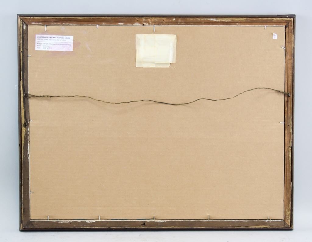 Oil on board, framed. Featuring two men traveling through a forest path. One is on a white horse while the other is walking beside him. Label on verso reads "Westbridge Find Art Auction House [...] Antique 18-19th Century Oil on Board Painting / Artist: Unknown / Size: 23.5" x 17.5" ". 43 x 57 cm (17 x 22.5 in), Frame: 51 x 64 cm (21 x 25 in).