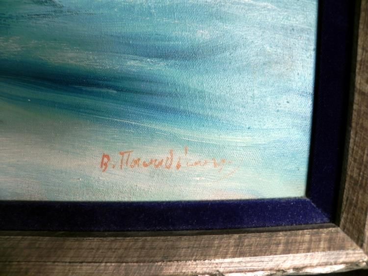 We are offering this magnificent painting painted in Greece. It is in a nice wood frame, and the signature on the piece is hard to make out, though reads "B. Trou...".Medium: Oil on Board -Frame: Wood and Dark Blue Matting - Image Size: 38.5" x 18.5" -Frame Size: 43" x 23" -Image Condition: Excellent -Frame Condition: Good, Some Wear and Scratches
