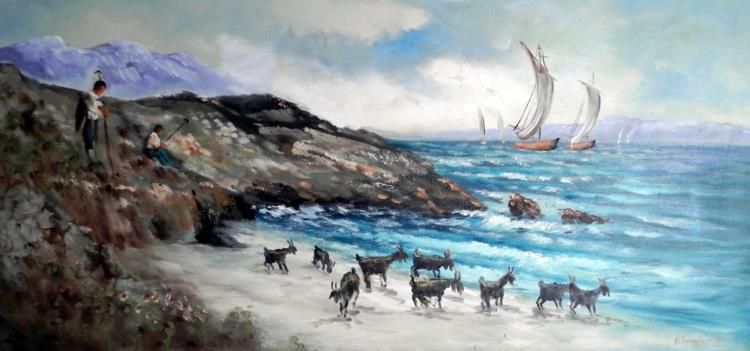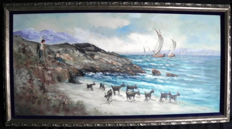 We are offering this magnificent painting painted in Greece. It is in a nice wood frame, and the signature on the piece is hard to make out, though reads "B. Trou...".Medium: Oil on Board -Frame: Wood and Dark Blue Matting - Image Size: 38.5" x 18.5" -Frame Size: 43" x 23" -Image Condition: Excellent -Frame Condition: Good, Some Wear and Scratches