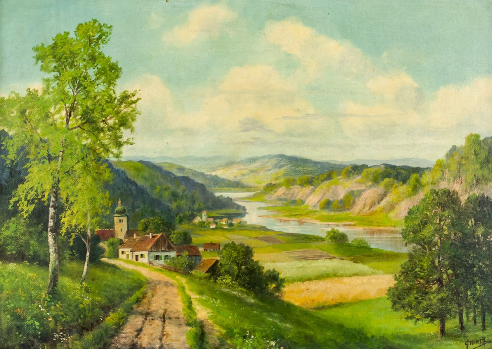 Oil on board, framed. Featuring a landscape scene. Signed G. WIRTH on the lower right corner. 48 x 68 cm (18.9 x 26.7 inches). Framed size: 64 x 83 cm (25.2 x 32.7 inches).