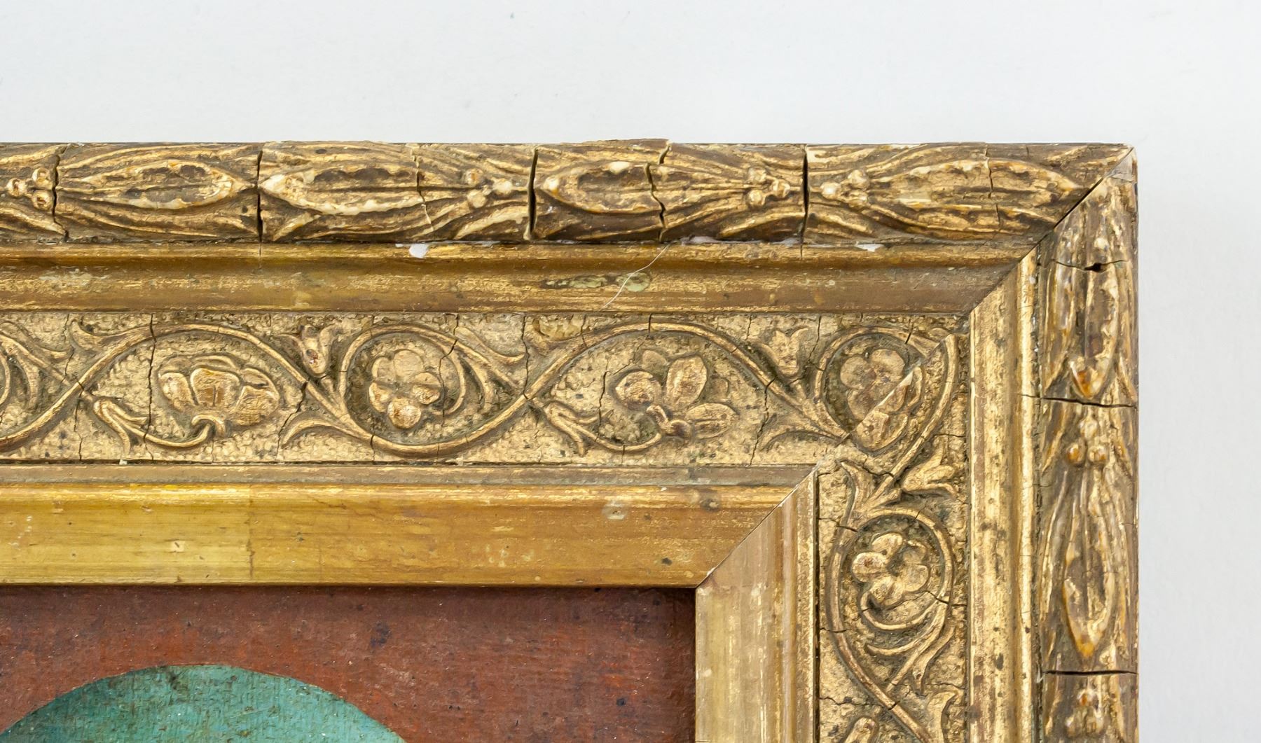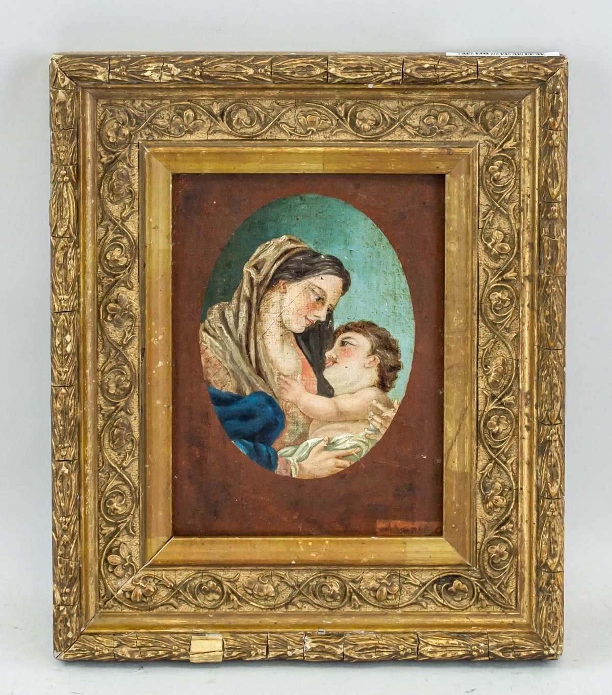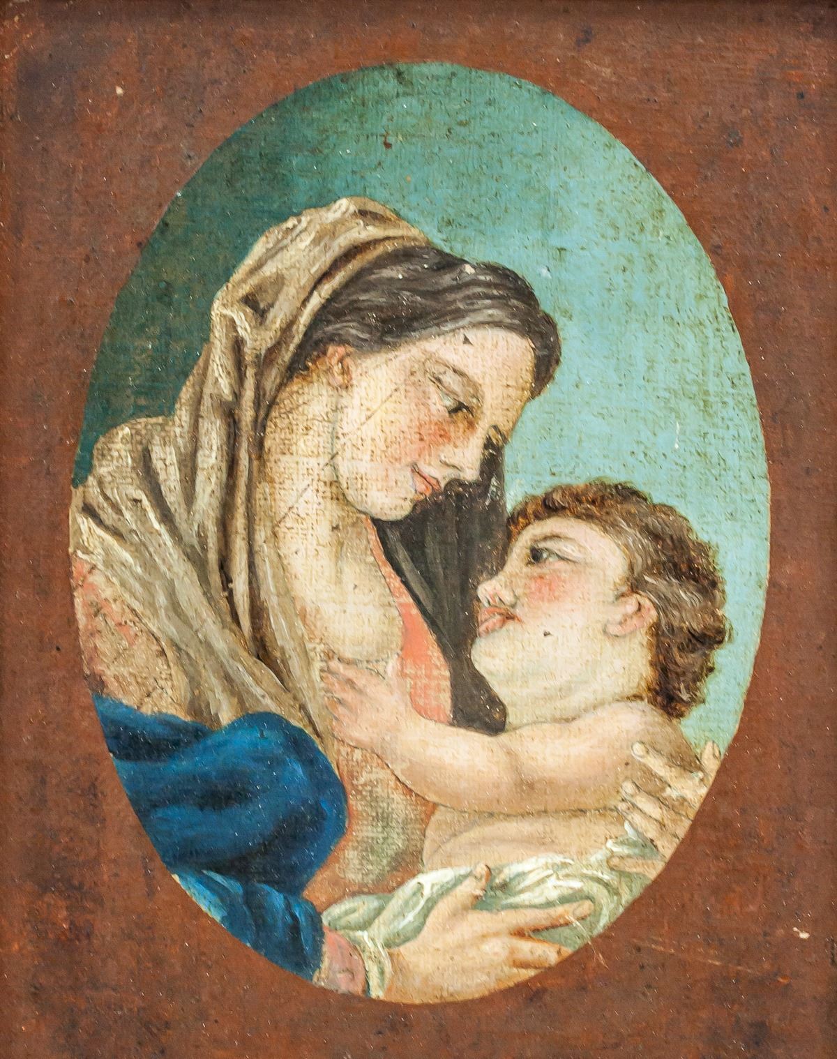 Oil on board, gilt frame. Featuring Virgin Mary with Jesus. 16 x 12 cm (6.3 x 4.7 inches). Frame size: 24 x 20 cm (9.5 x 7.9 inches). PROVENANCE: Private European collection (Bayern, Germany)