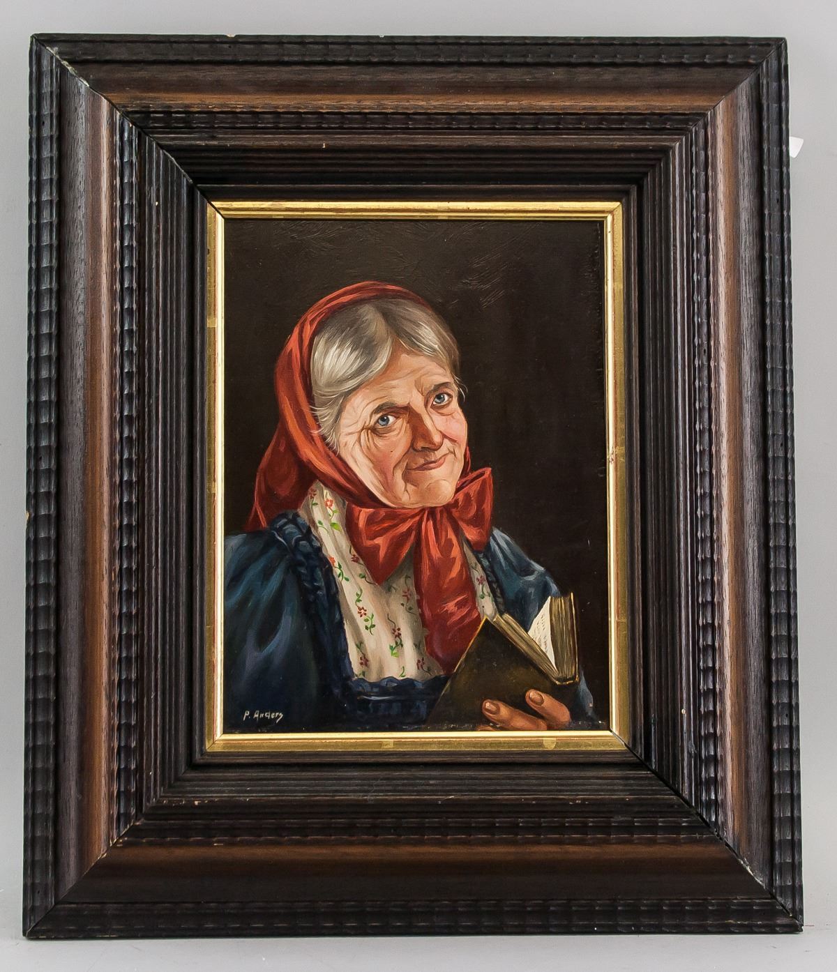 Oil on board, framed. Featuring a portrait of a woman. Signed P. Anders on the lower left corner. Inscribed in pencil on stretcher bar 09-50 with illegibly markings. 23 x 17 cm (9.1 x 6.7 inches). Framed size: 41 x 35 cm (16.1 x 13.8 inches). PROVENANCE: Private European collection