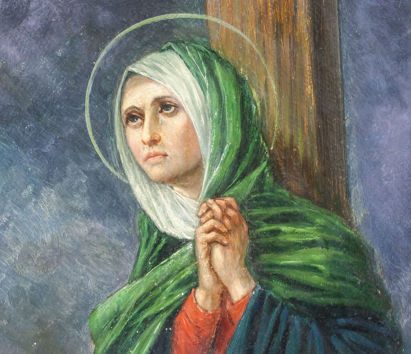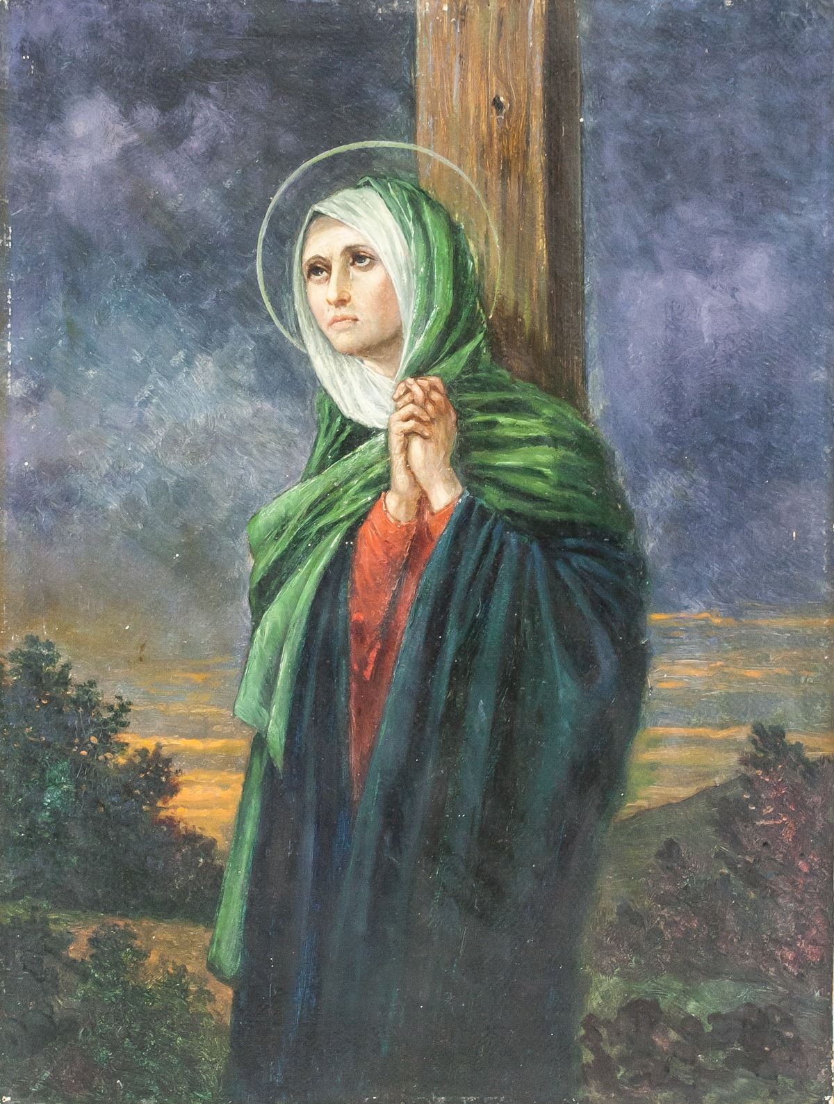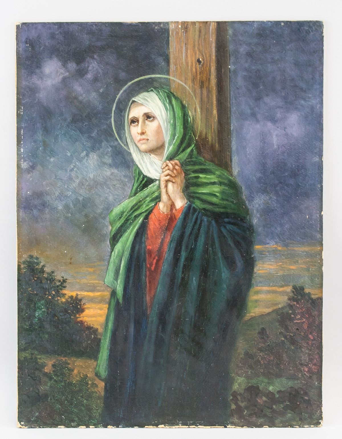 Oil on board. Featuring portrait of a woman with a round halo behind her head. Her hands are clasped in front of her and she is looking up and left. 53 x 40 cm (21 x 15 inches). PROVENANCE: This lot carries limited provenance from a Private German estate