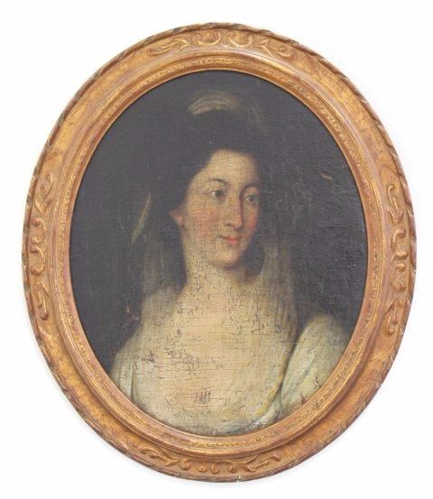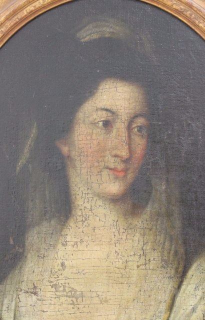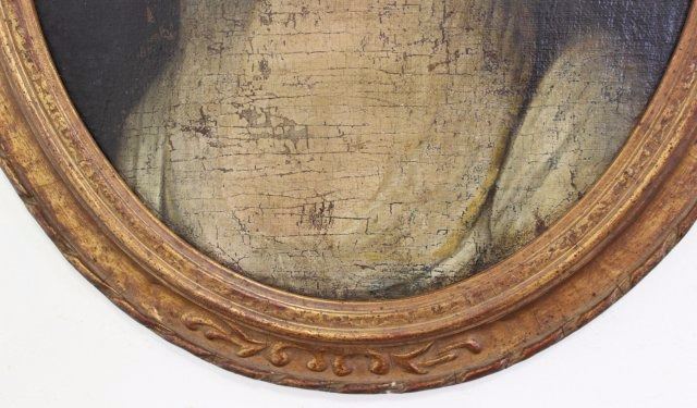 Oil on board. Oval frame. Possibly 18th century. Approx. 21 1/2" x 17 3/4" image, 27" H x 23" W framed. From the home of a N.Y. designer.