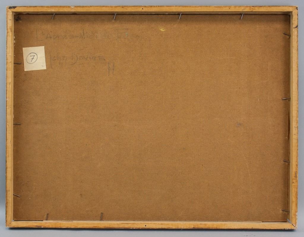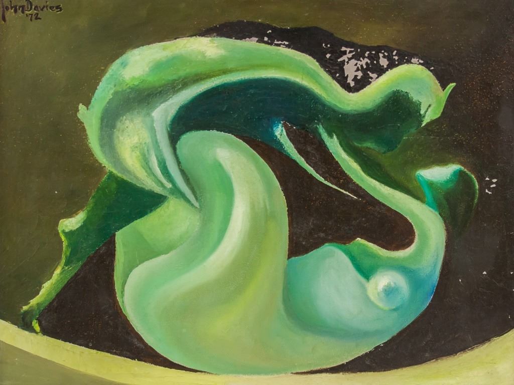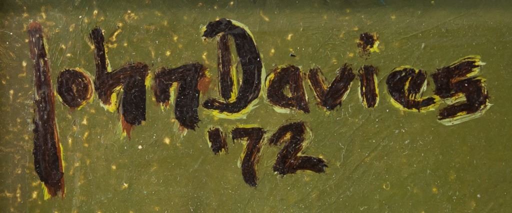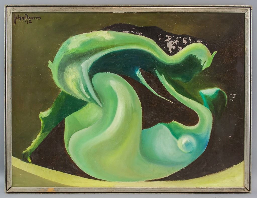 Oil on board, framed. Featuring surrealist composition of two figures on top of each other. Signed "John Davies" to the top left corner, with "72" inscribed beneath the signature. Damage to oil paint. Faint inscription on verso. Canvas size: 45 x 60 cm (17.5 x 23.5 inches). Frame size: 48 x 64 cm (19 x 25 inches).