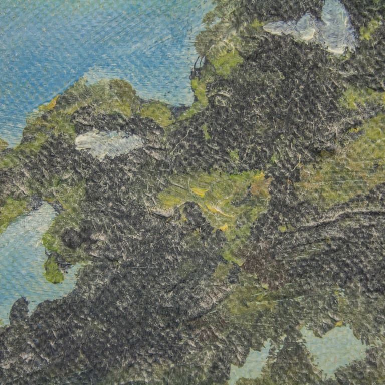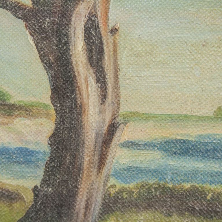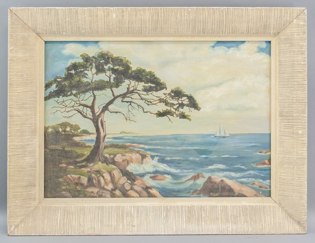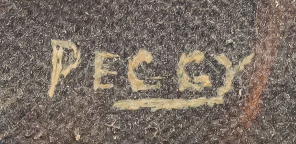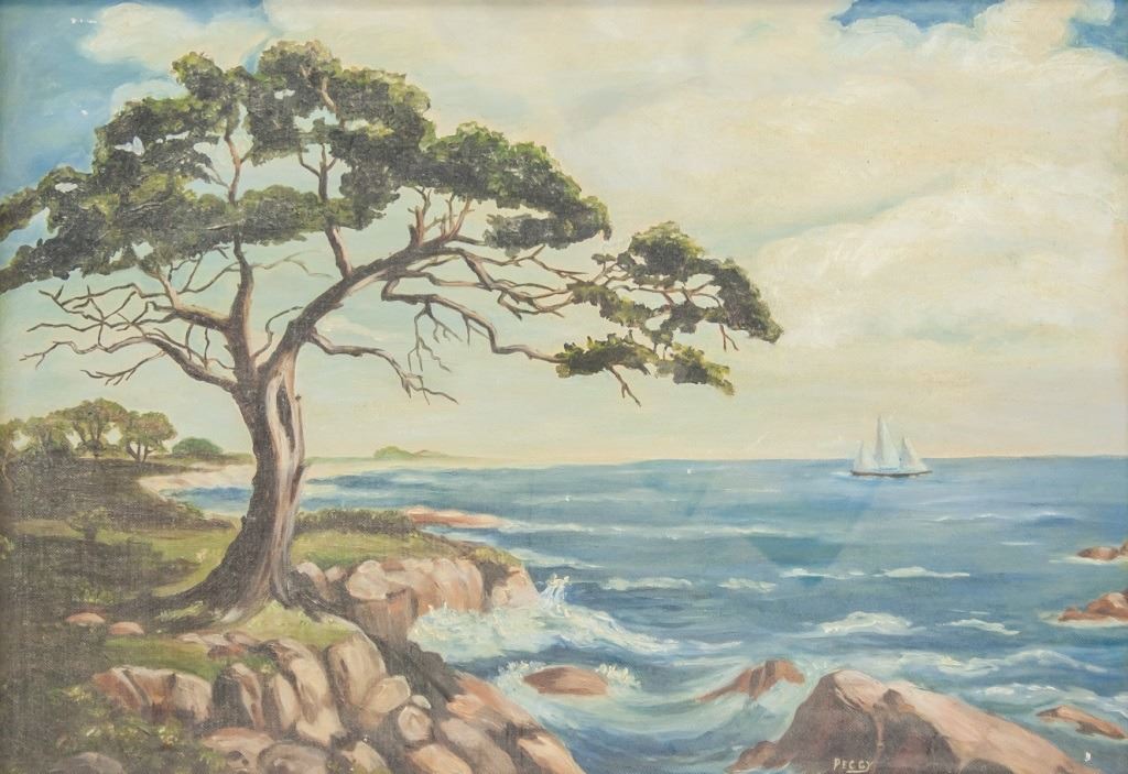 Oil on board, framed. Featuring seaside landscape scene. Signed "Peggy" to the bottom right. Faint pencil inscription on vereso reads "Peggy [...]". Canvas size: 34 x 49 cm (13.5 x 19.5 inches). Frame size: 50 x 65 cm (19.5 x 25.5 inches).