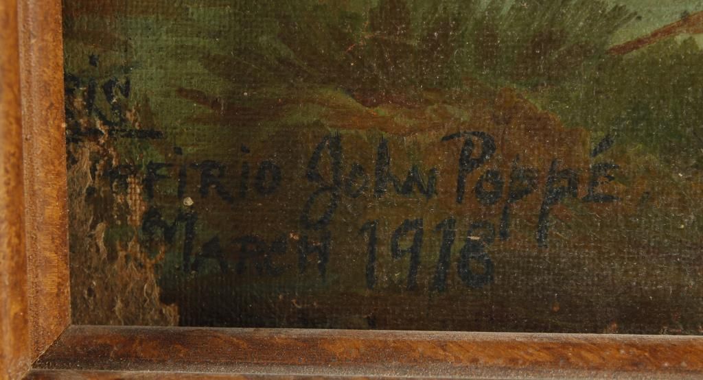 1918. Slight corner damage and some cracking on painting. Very restorable. Image size 19" wide x 13" high. Framed 26" wide x 20" high.