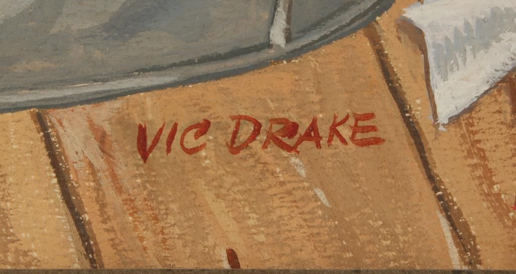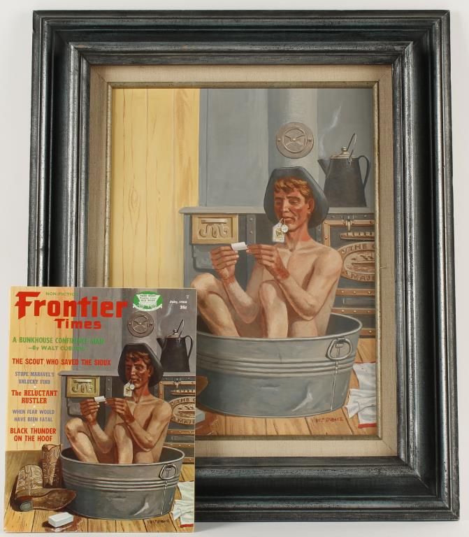 Depicting a cowboy bathing in a metal tub. Image was used for the cover of the July 1968 edition of Frontier Times Magazine, a copy of which is included. Image 12' wide x 16" high. In wood frame 20" wide x 24" high.