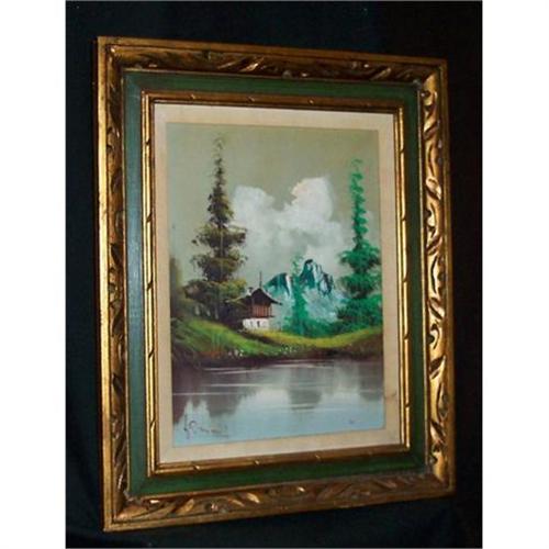 Here is a 1950's oil on canvas painting of an Alpine Village. it is featured in a gold leaf and green painted wood frame in excellent condition. Signed.