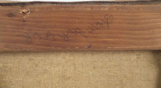 Unframed modern oil on canvas in the manner of Stuart Davis, still life. Unsigned. [Art: 16" x 20"]. Verso bears chalk auction marking; inscribed on stretcher in pencil, "Steinberger". Soiling, minor abrasions, frame rubbing.