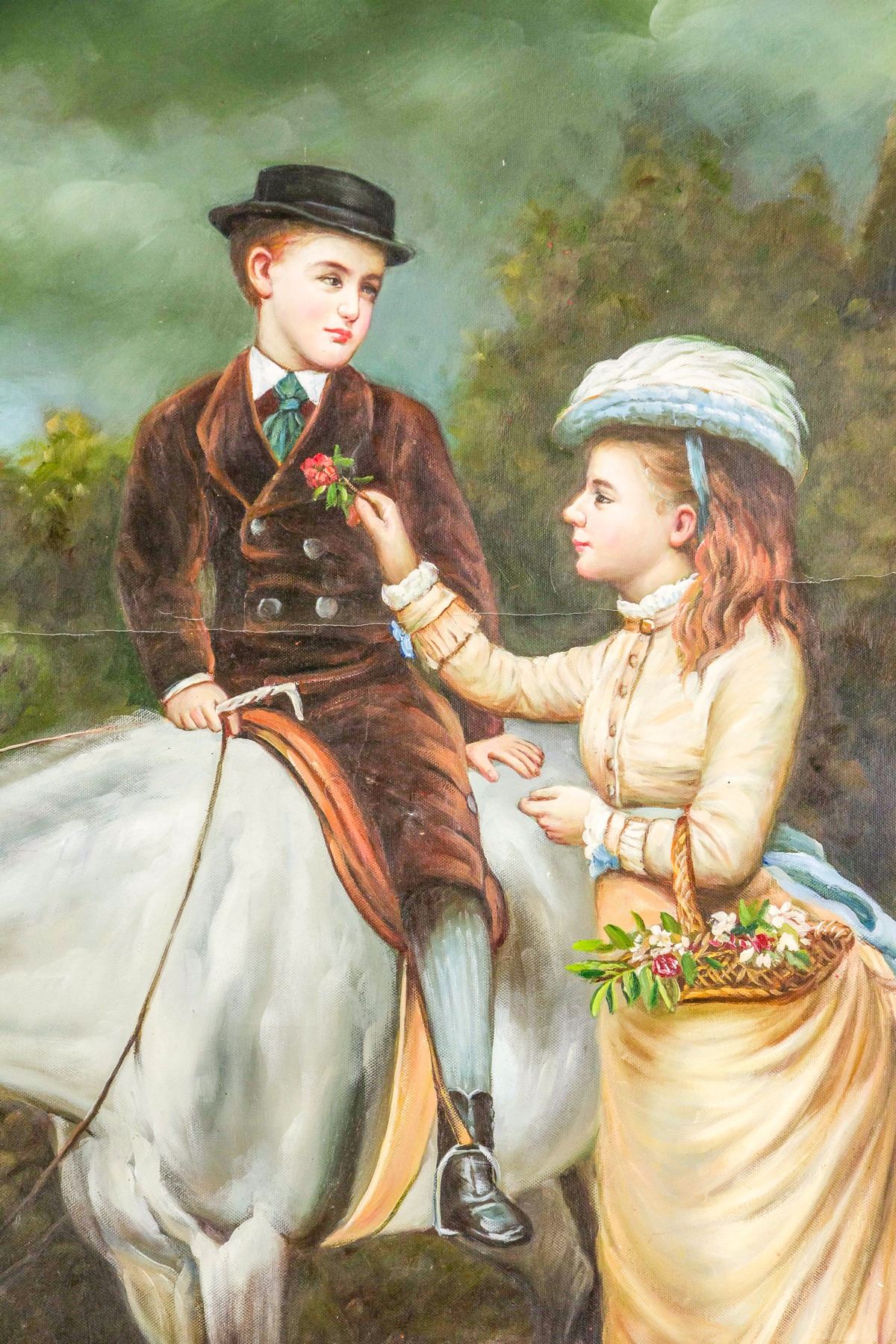 Painting of girl and boy on horse; oil on canvas; with Chinese company mark; 93 x 61 cm