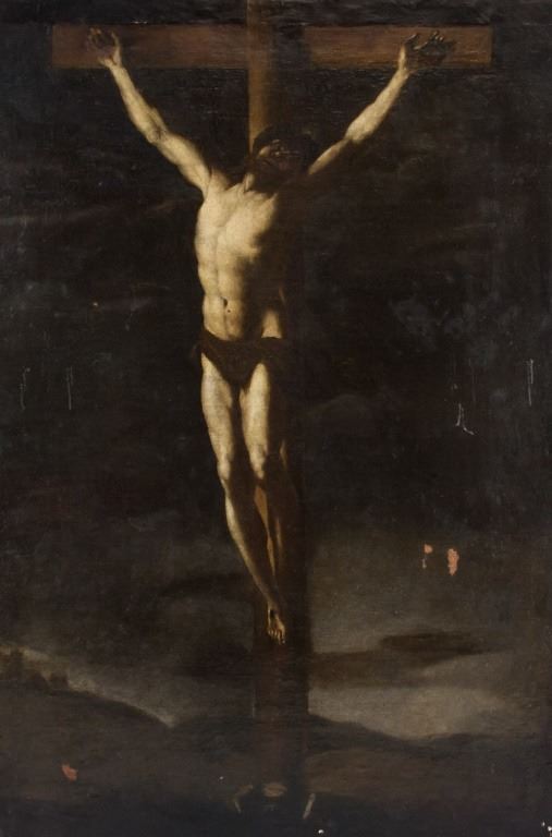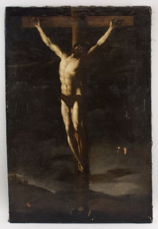 Oil on canvas. Featuring the crucifixion of Christ. Some chipping in the oil paint. 70 x 47 cm (27.6 x 18.5 inches).