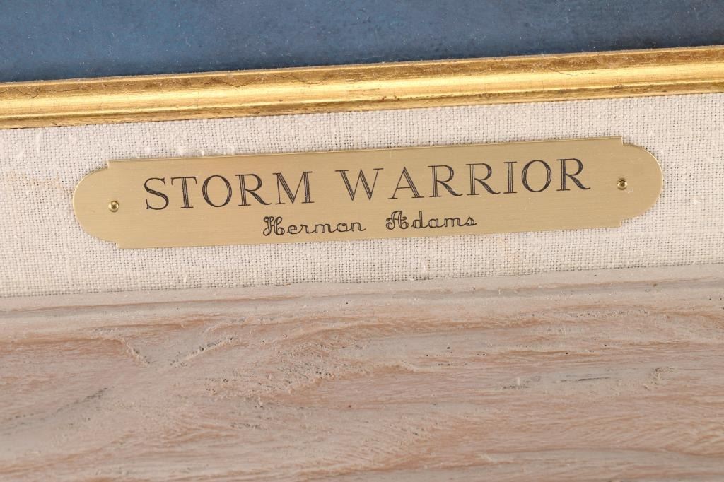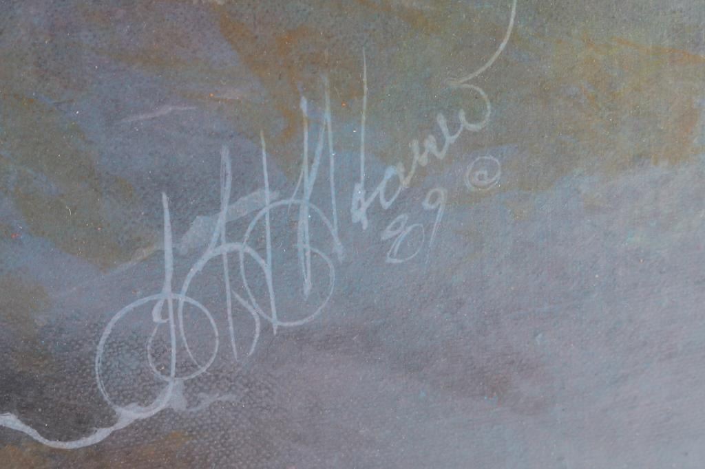 By Hermon Adams (1945-2021). Adams has said that "the important things in a painting are beauty, light, depth, and meaning", which he accomplishes in each of his paintings, creating a style that is unmistakably his own. Herman's images can be found on Leanin' Tree greeting cards, Candimar Designs cross-stitch, Milton Bradley puzzles, collector plates from the Bradford Exchange, The Mountain Tee Shirts, and Tree Free Greeting Cards. Measures 3' by 4', framed in natural wood.