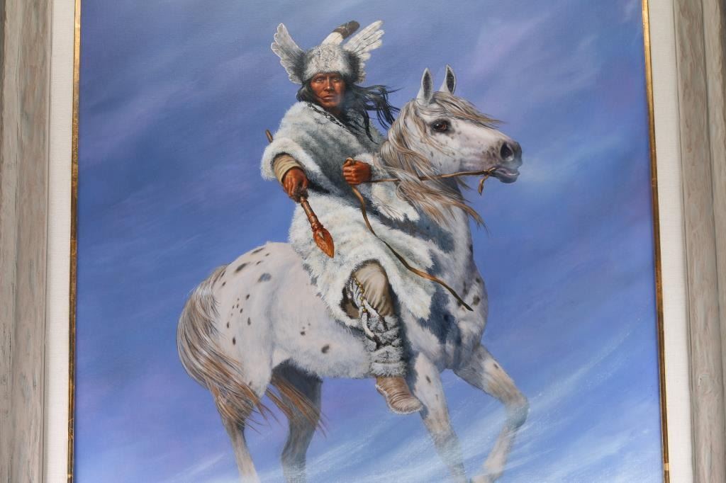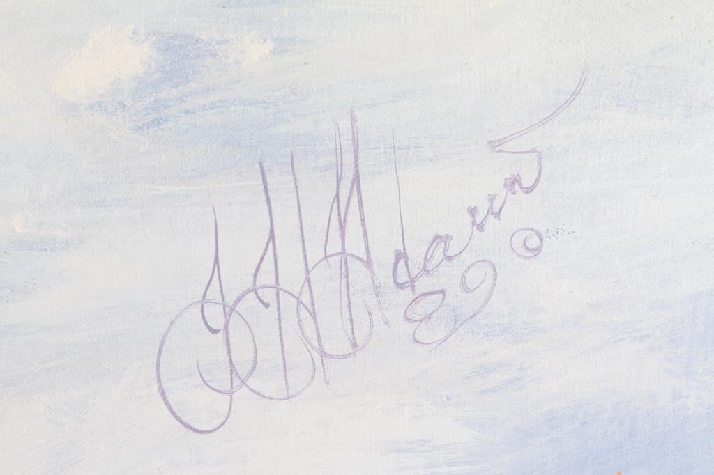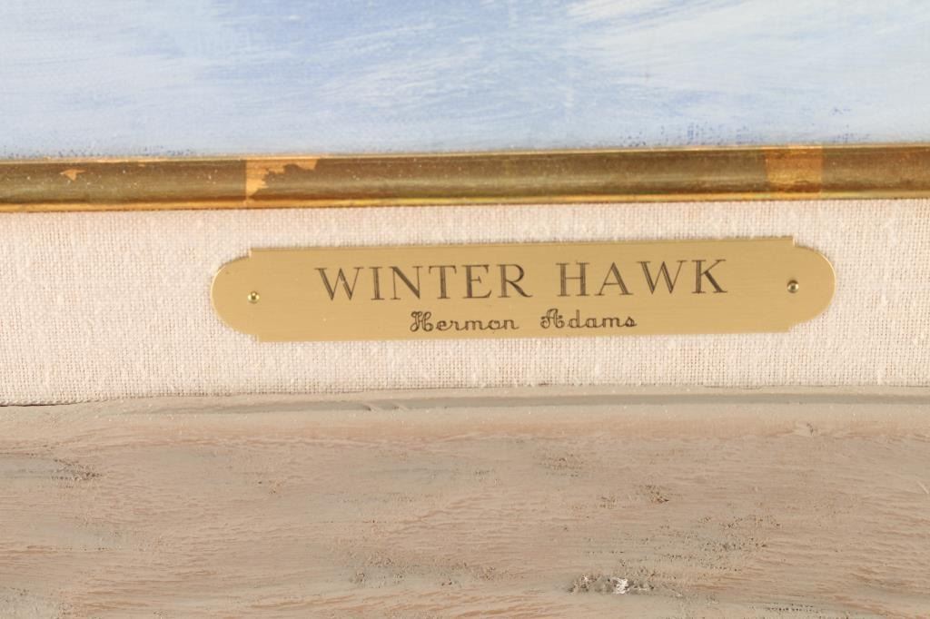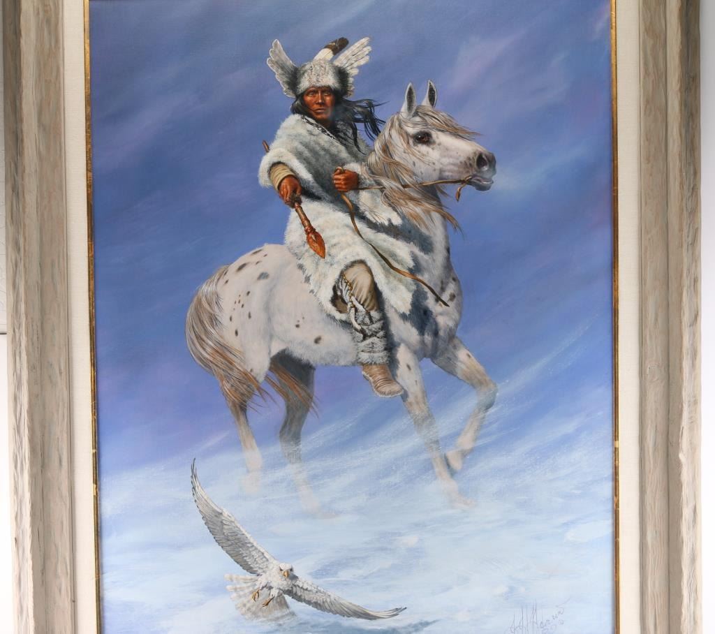 By Hermon Adams (1945-2021). Adams has said that "the important things in a painting are beauty, light, depth, and meaning", which he accomplishes in each of his paintings, creating a style that is unmistakably his own. Herman's images can be found on Leanin' Tree greeting cards, Candimar Designs cross-stitch, Milton Bradley puzzles, collector plates from the Bradford Exchange, The Mountain Tee Shirts, and Tree Free Greeting Cards. Measures 3' by 4', framed in natural wood.