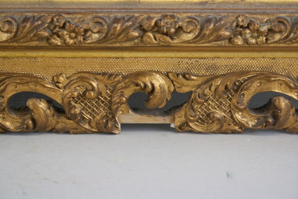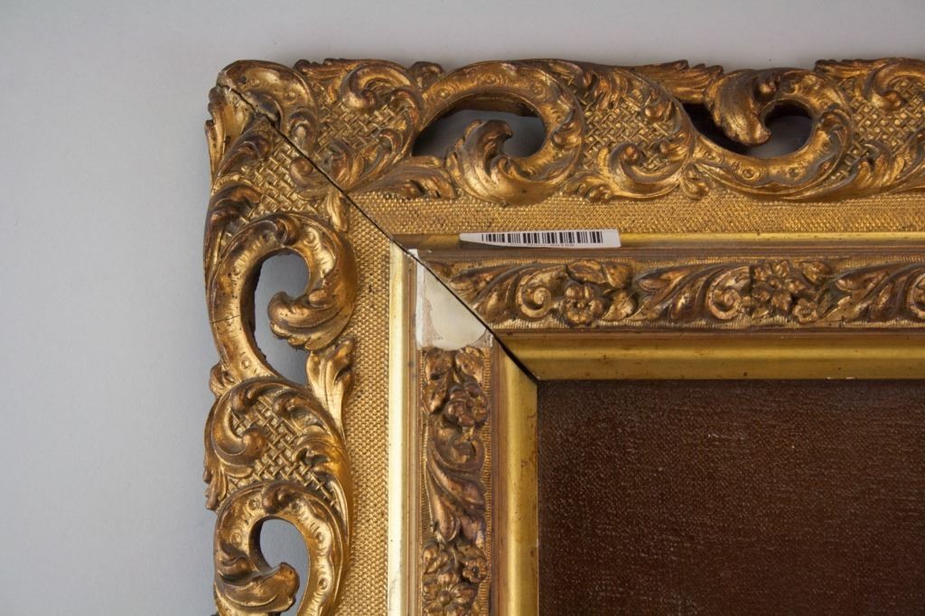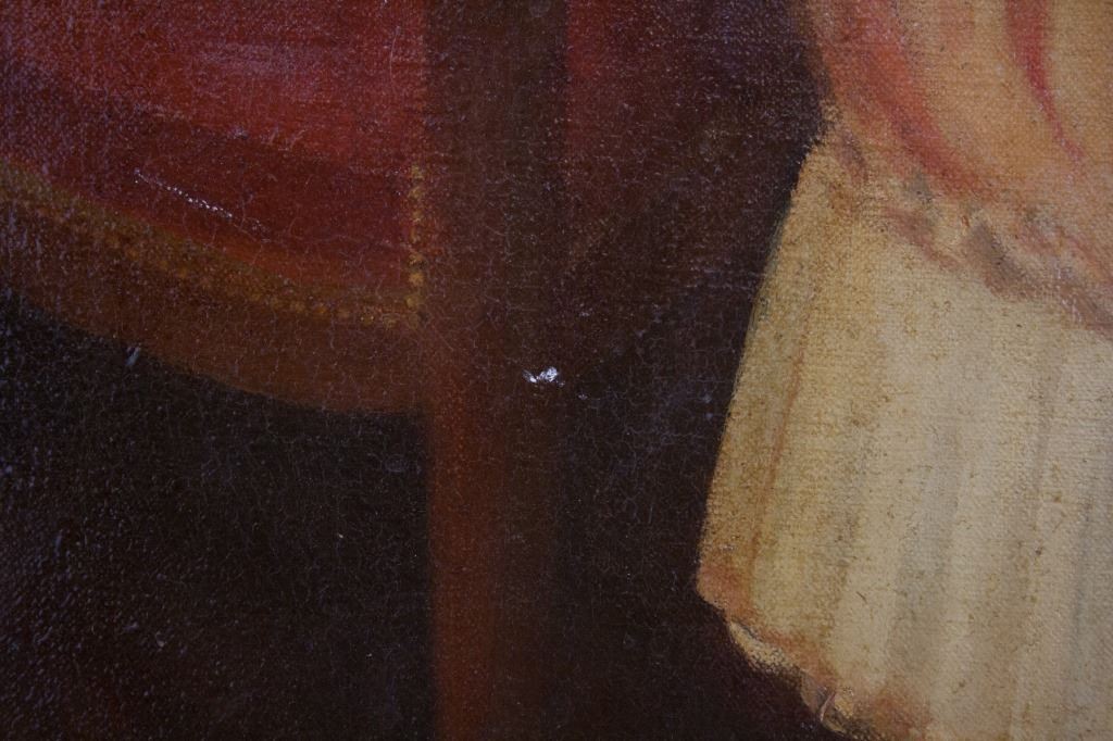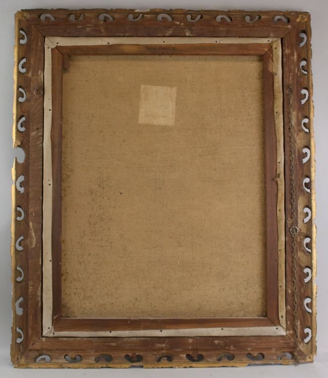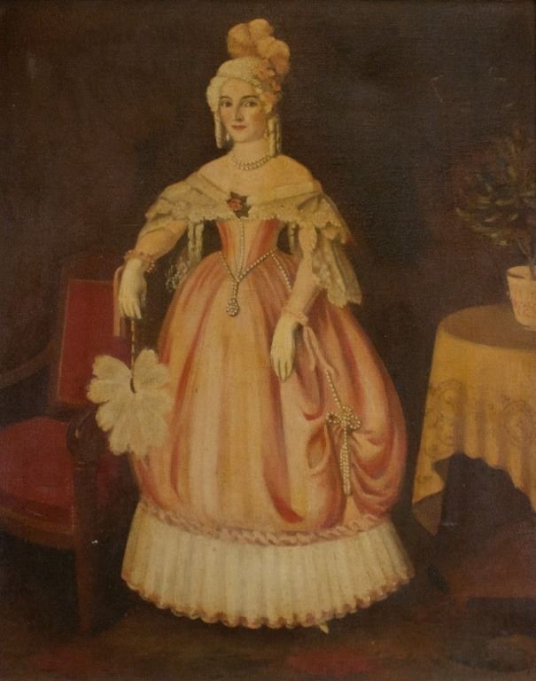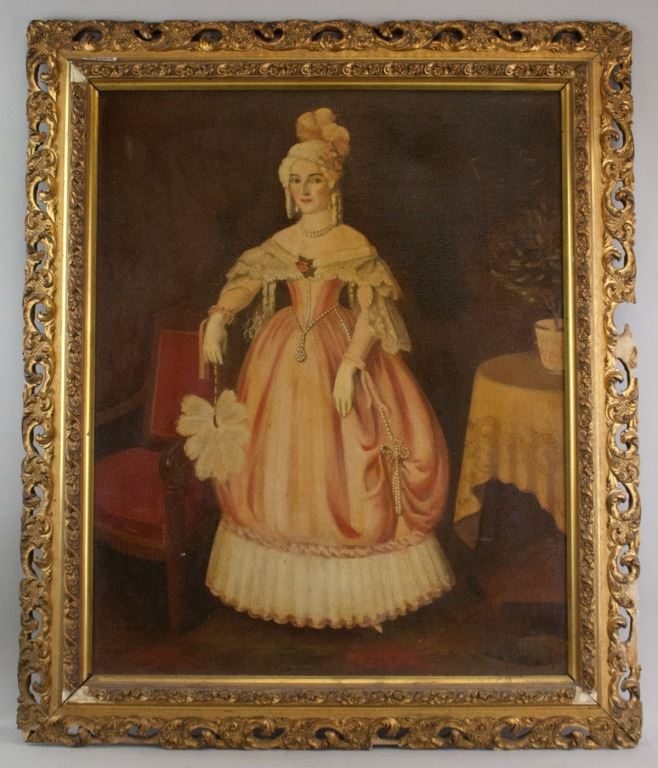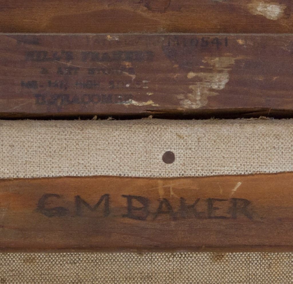 Oil on canvas, framed. Featuring full body portrait of a woman in a pink gown. "GM BAKER" stamped on top stretcher bar. Damaged frame. 73 x 58 cm (28.5 x 23 inch) F: 92 x 78 cm (36 x 30 inch) .