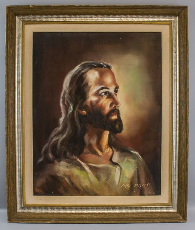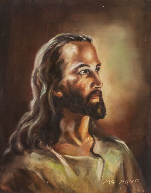 Oil on canvas, framed. Featuring portrait of Jesus. Signed "NG FONG" to the bottom right corner. Canvas size: 60 x 47 cm (23.5 x 18.5 inches). Frame size: 78 x 65.5 cm (30.7 x 25.7 inches).