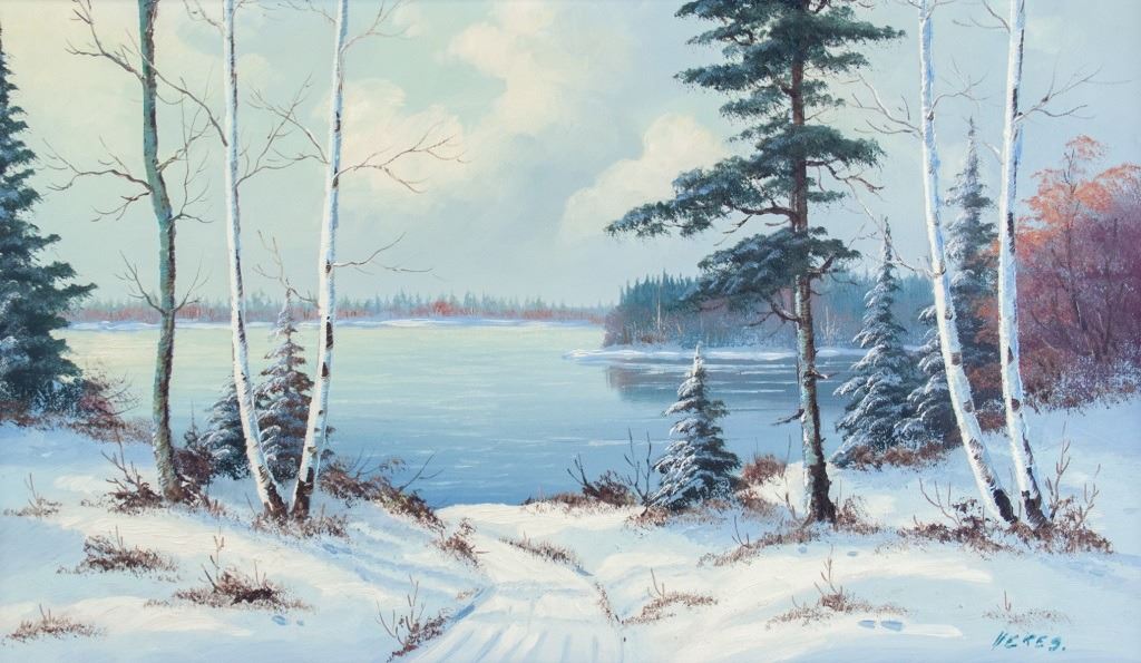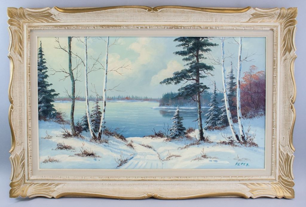 Oil on canvas, framed. Featuring winter landscape scene of a lake with snow piled on the banks. Signed "Veres" to the bottom right corner. Canvas size: 49 x 64 cm (19.25 x 25 inches). Frame size: 70 x 107 cm (27.5 x 46 inches).