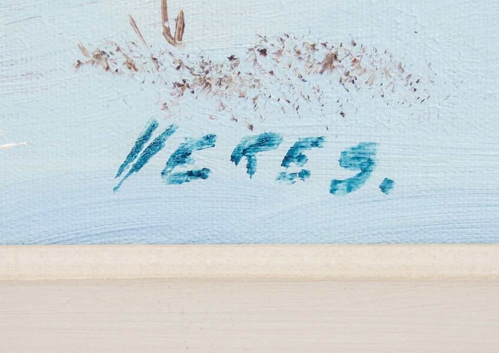 Oil on canvas, framed. Featuring winter landscape scene of a lake with snow piled on the banks. Signed "Veres" to the bottom right corner. Canvas size: 49 x 64 cm (19.25 x 25 inches). Frame size: 70 x 107 cm (27.5 x 46 inches).