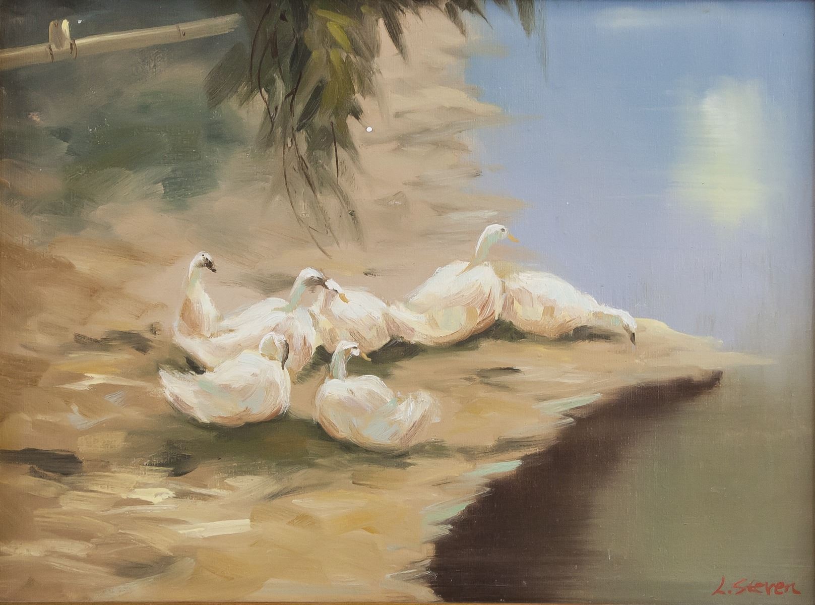 Oil on canvas, framed. Featuring a landscape scene and ducks on the lake. Signed L. Steven on the lower right corner. Inscribed on the upper right corner in pencil 148,-Euro. 29 x 39 cm (11.4 x 15.4 inches. Framed size: 40 x 51 cm (15.8 x 20.1 inches). Provenance: Private European collection, Bayern, Germany)