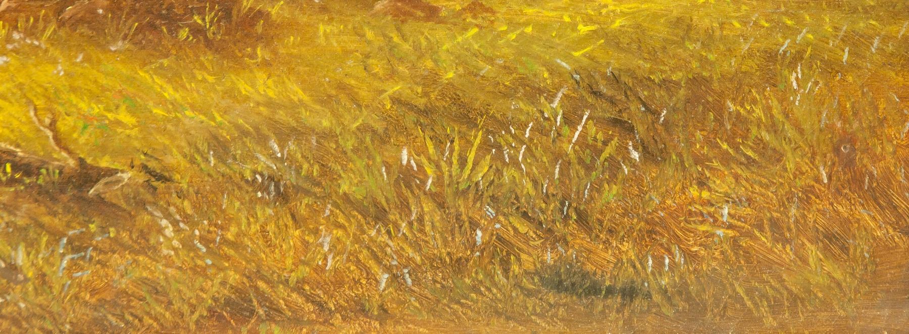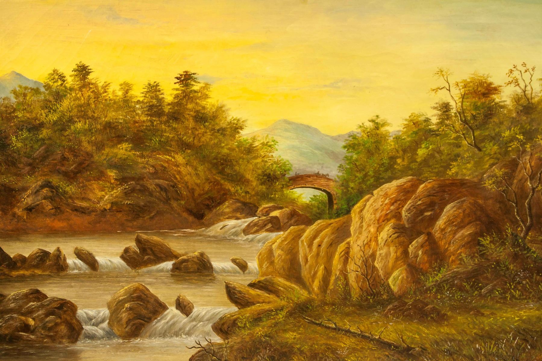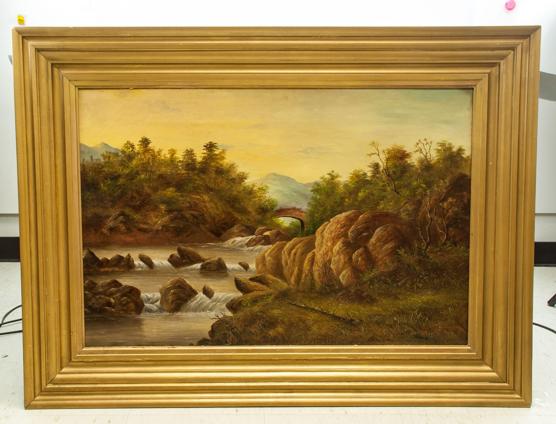 Oil on canvas framed, nature forest and river landscape scene. 24 x 35 inch (61 x 89 cm).
