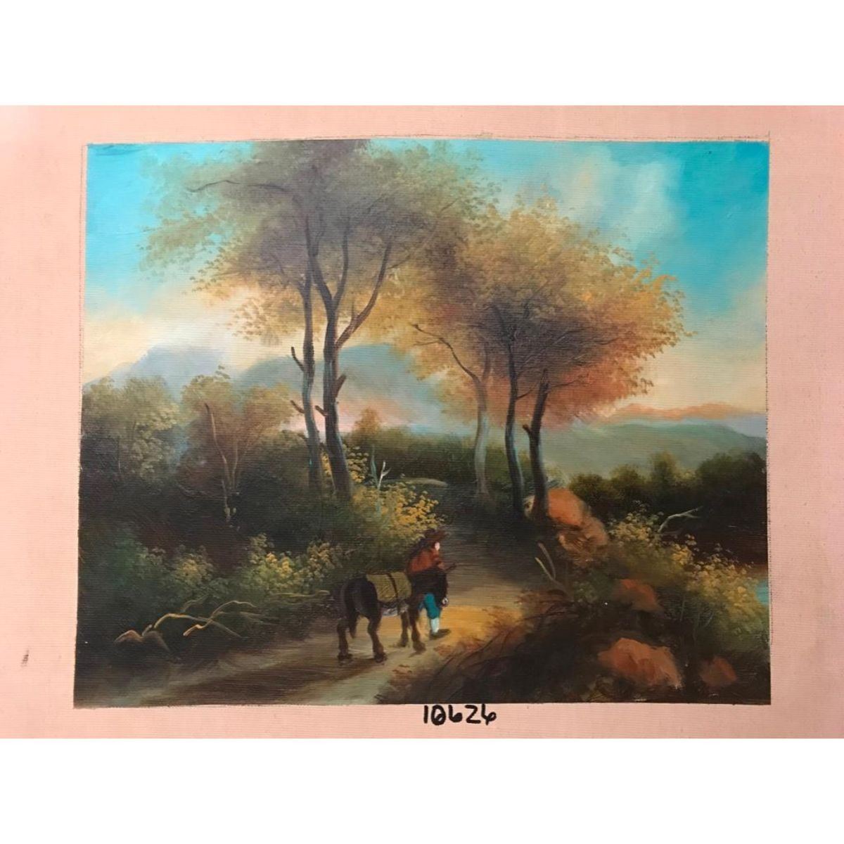 Oil on canvas painting of a mountain landscape scene with peasant  man & donkey. Unstretched canvas. 8" X 10".Â