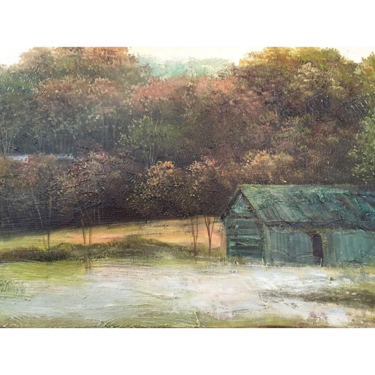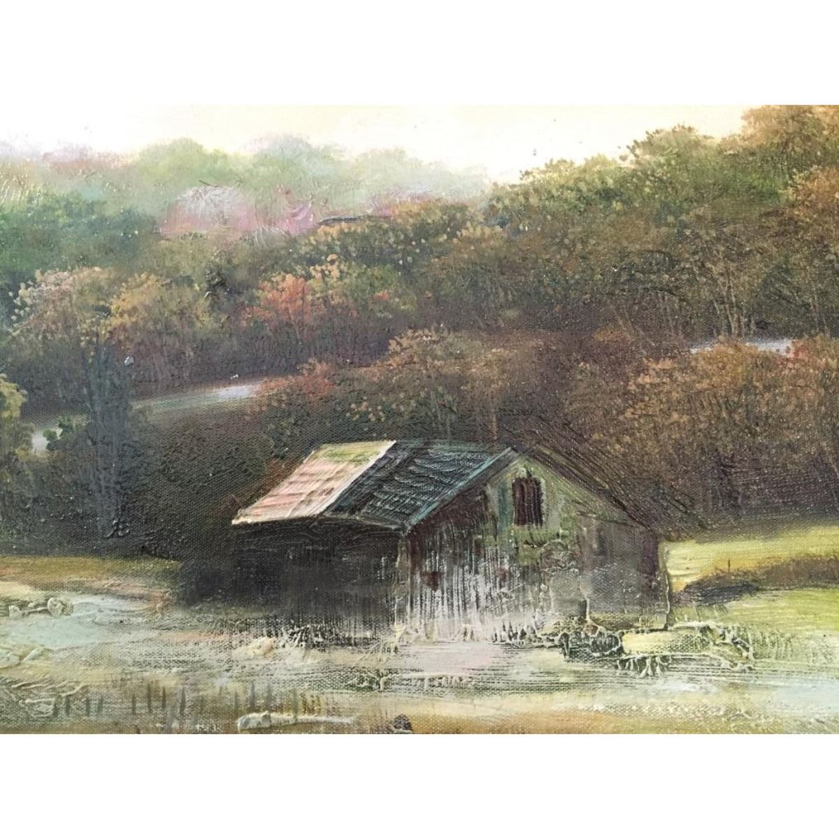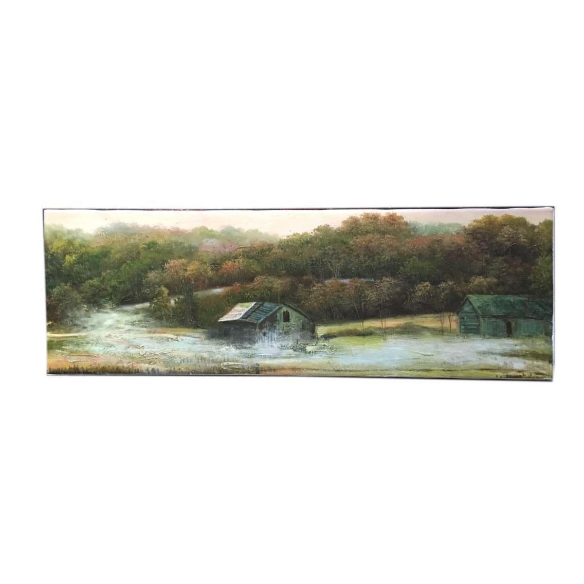 20thc oil on canvas painting of a rural mountain landscape, with two barns surrounded by trees & mountain mist. 10" X 30" stretched canvas, unframed.