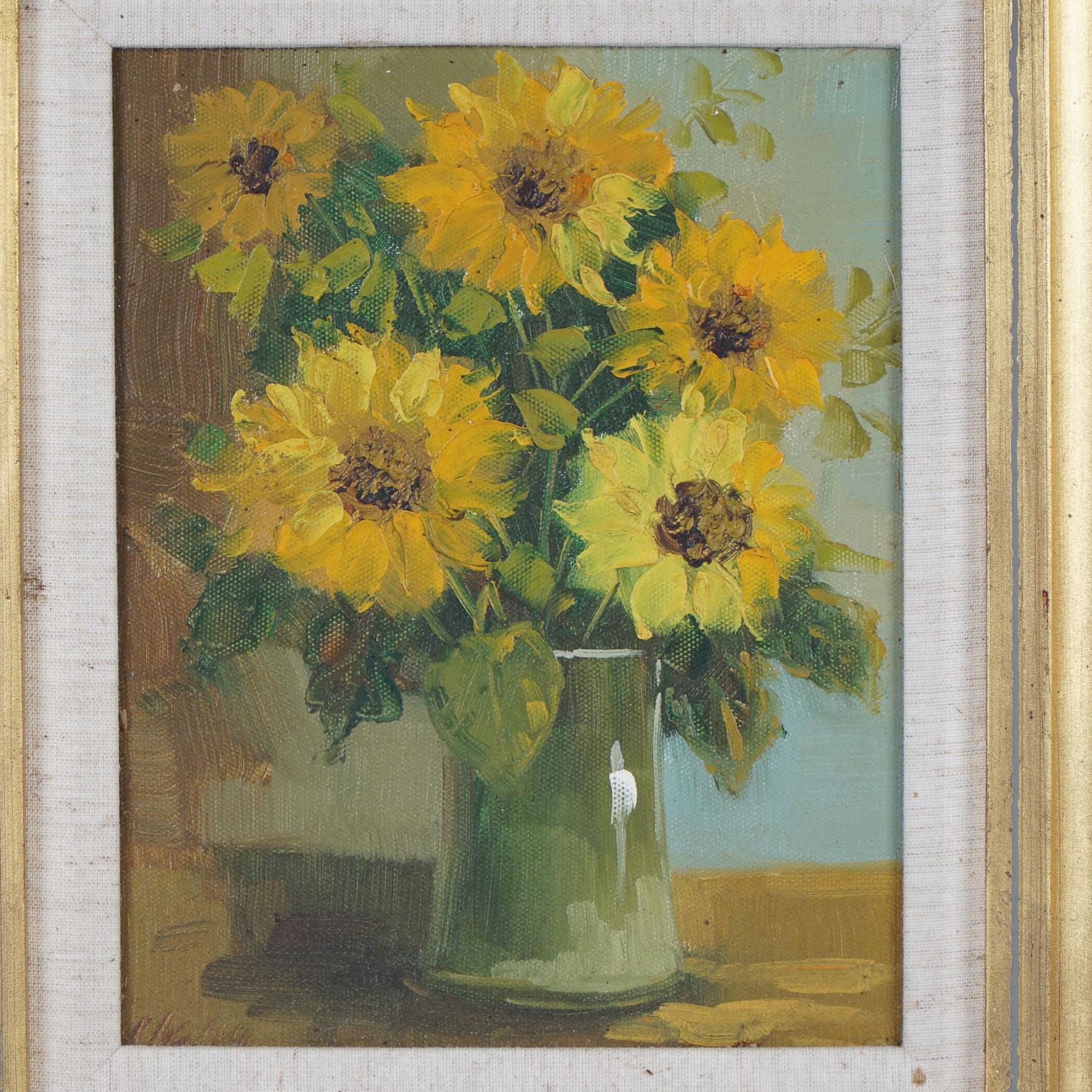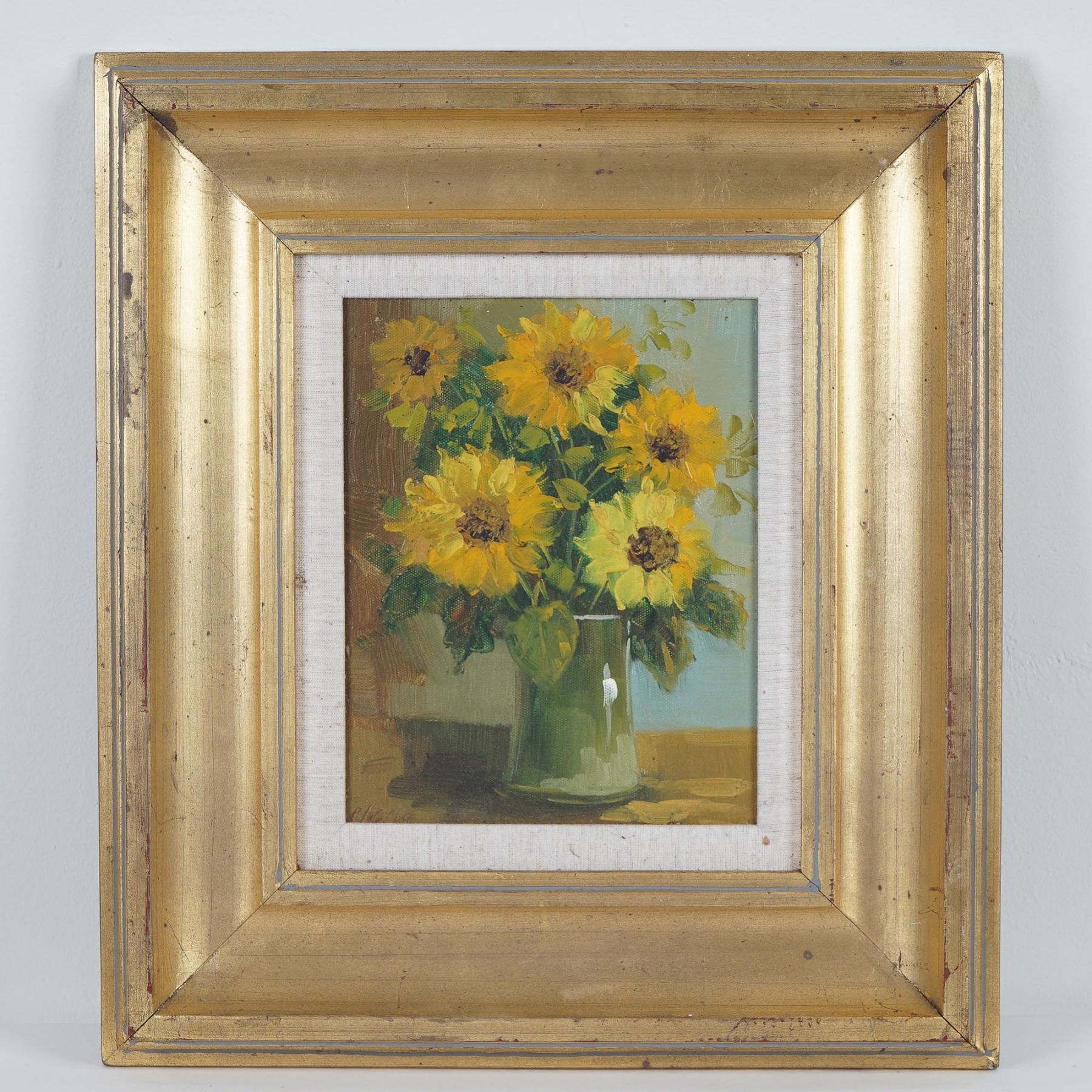 Charming still life oil painting on canvas depicting a bouquet of vibrant yellow sunflowers arranged in a green vase, set against a muted background. Executed with expressive brushstrokes and thick impasto highlights, the painting captures the warm, sunny character of the flowers in a traditional realist style. The work is signed by the artist in the lower left, though the signature is not clearly legible. Framed in a gilt wood frame with linen liner.