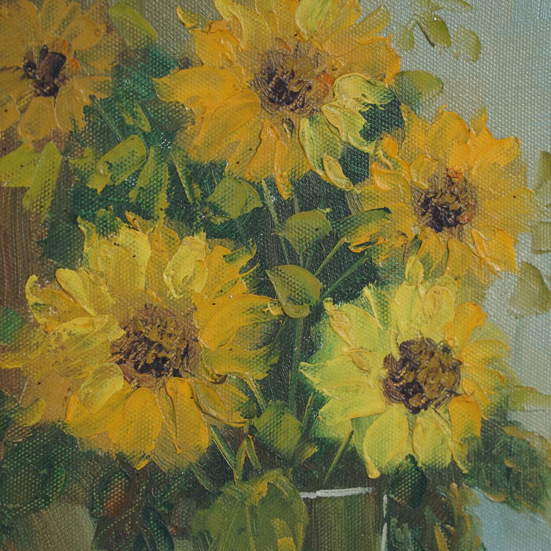 Oil on Canvas Painting Still Life of Sunflowers in Vase, Signed