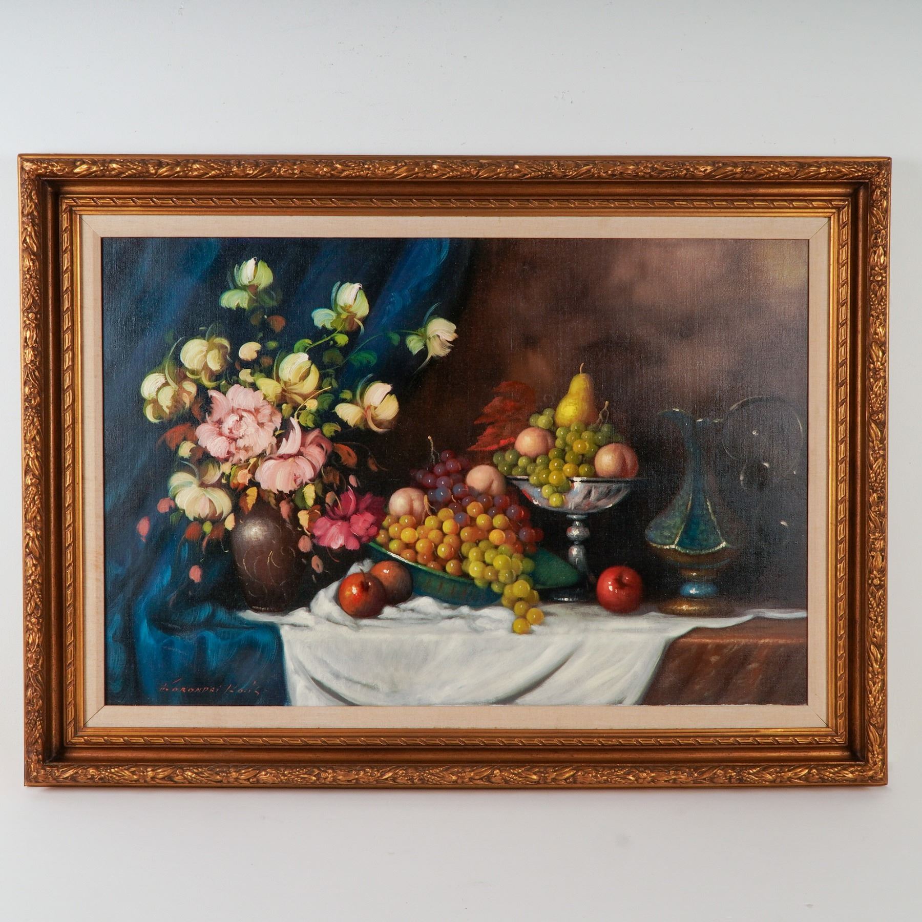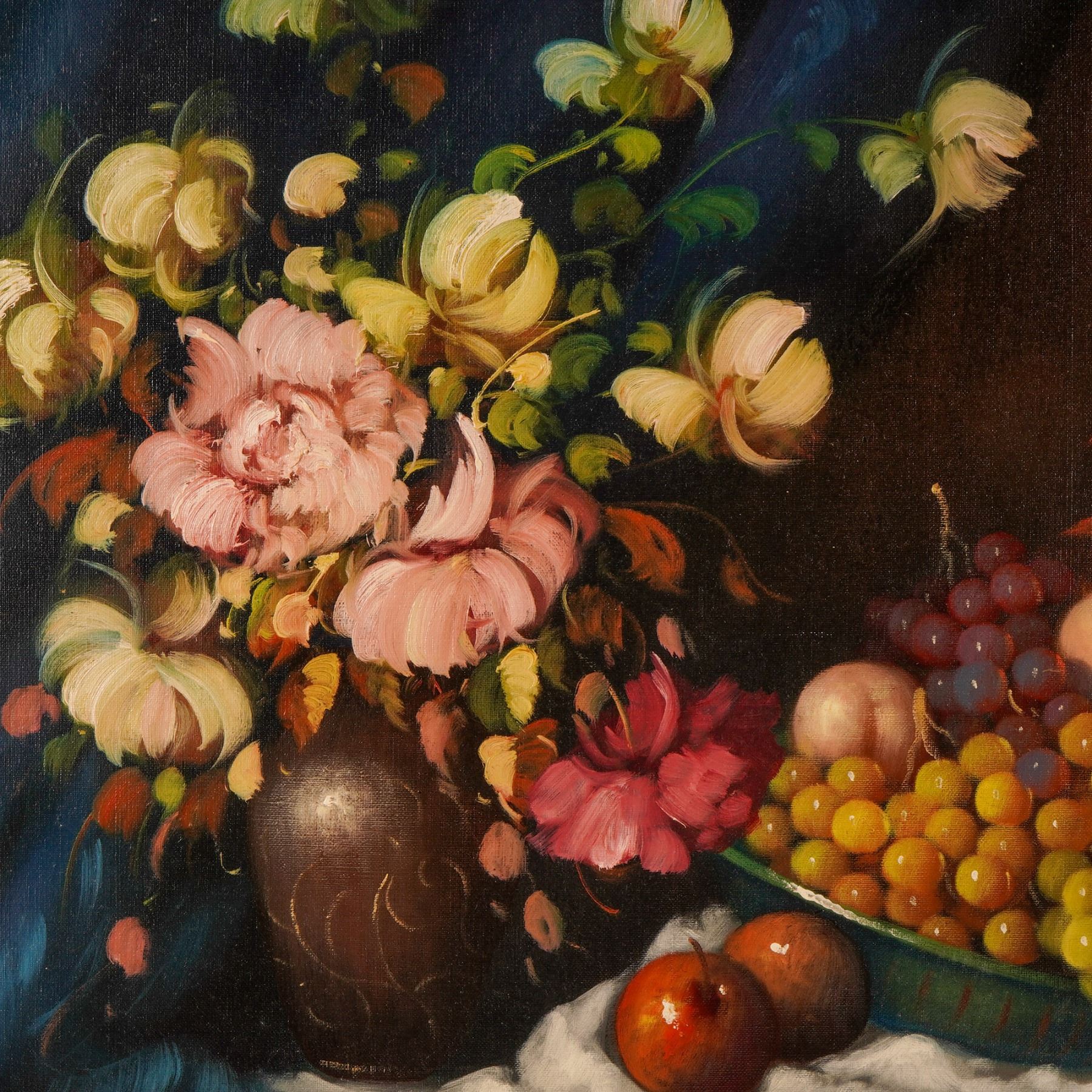 Oil on Canvas Painting, Still Life with Flowers and Fruits, Signed