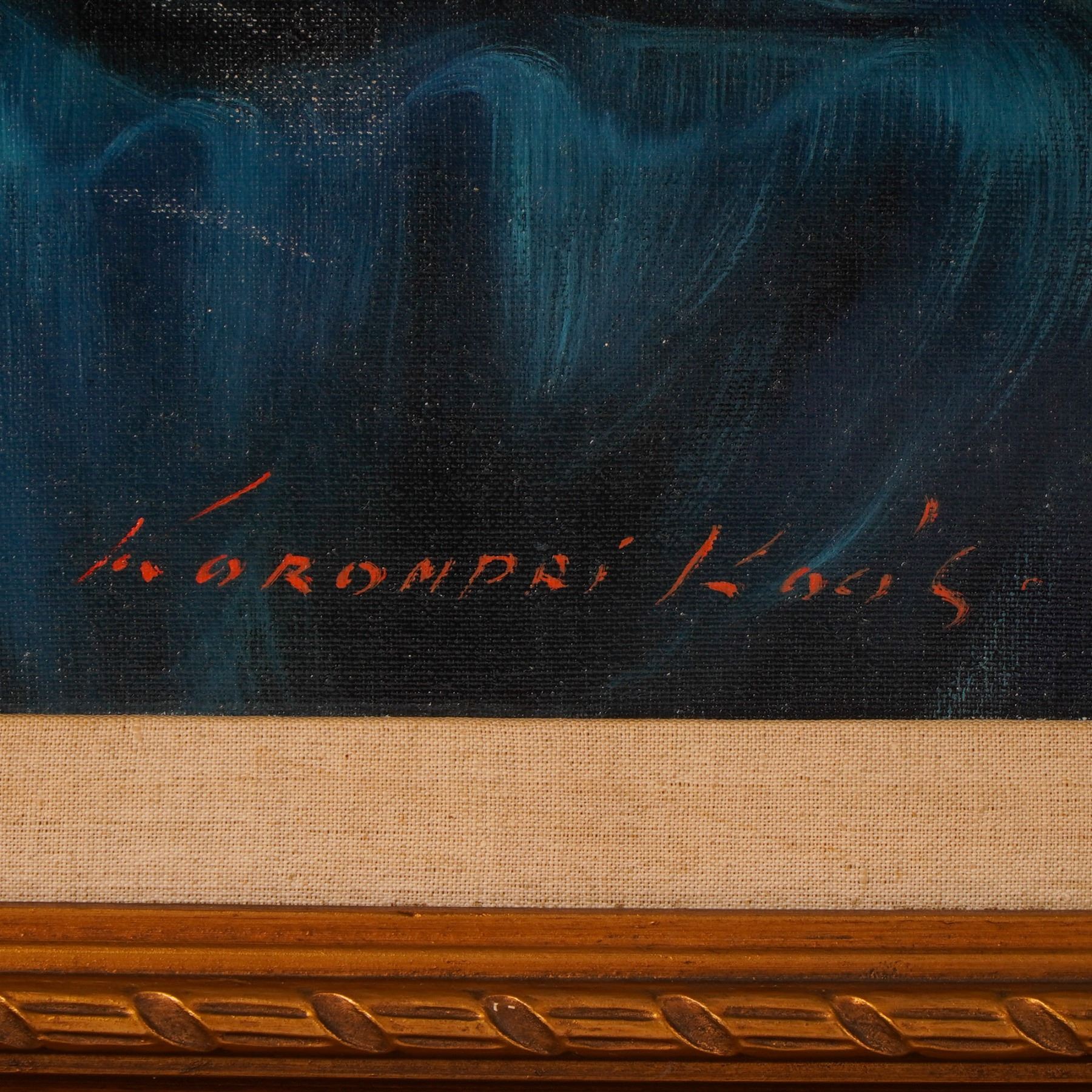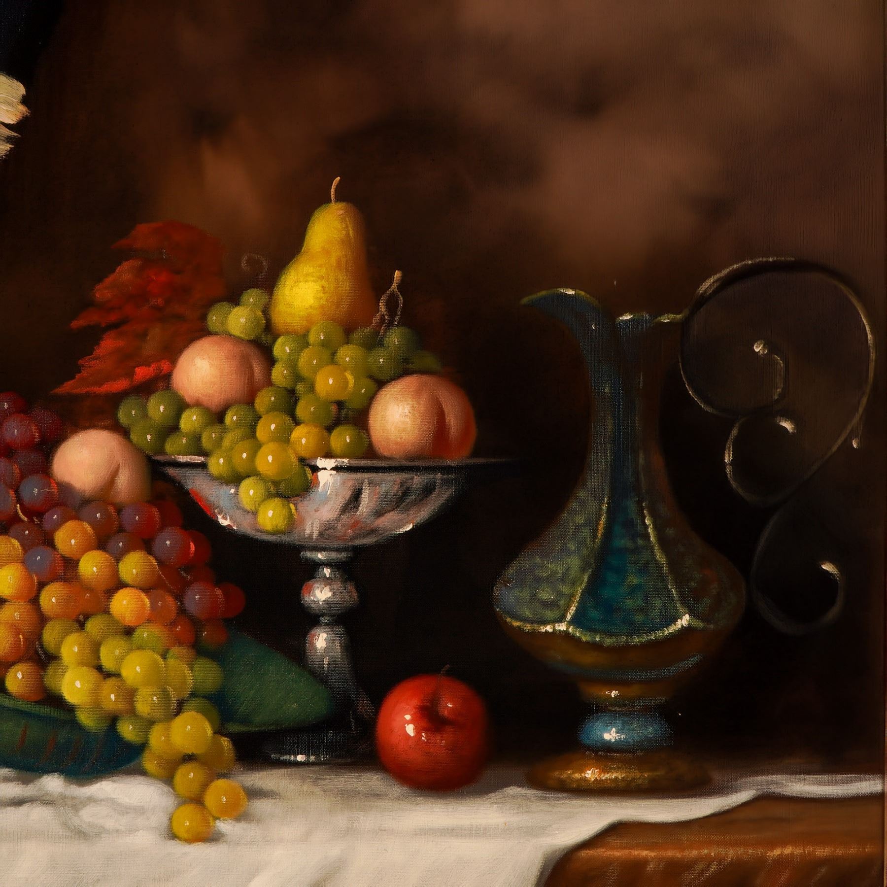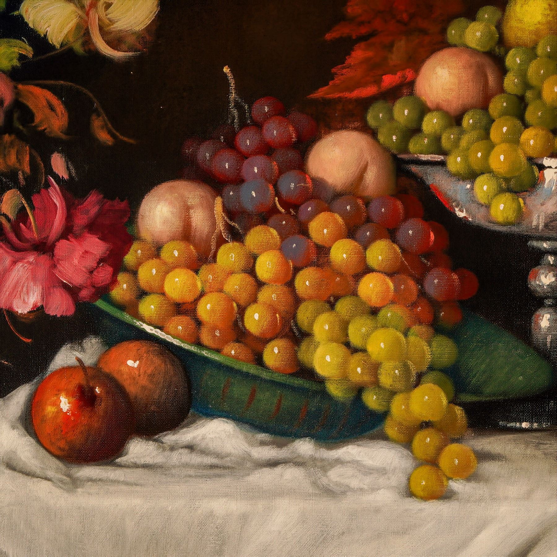 A beautifully rendered oil on canvas still life depicting an abundant arrangement of grapes, peaches, apples, and a pear beside a vase of full-blooming flowers. The artist skillfully balances rich, saturated color with soft, atmospheric lighting, creating depth and warmth across the draped fabrics and gleaming fruit. A silver compote and glass vessel add elegant highlights, while the lush floral bouquet anchors the composition with dynamic brushwork and texture. Presented in an ornate giltwood frame with classic detailing that complements the composition's old-world refinement. Signed at lower left.