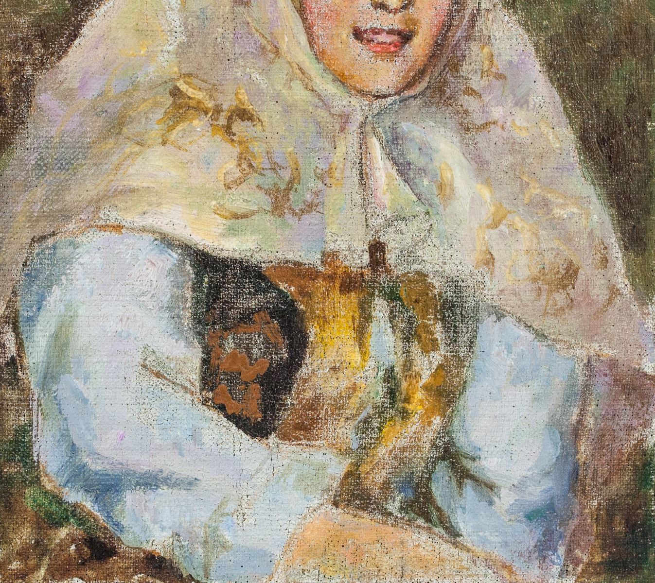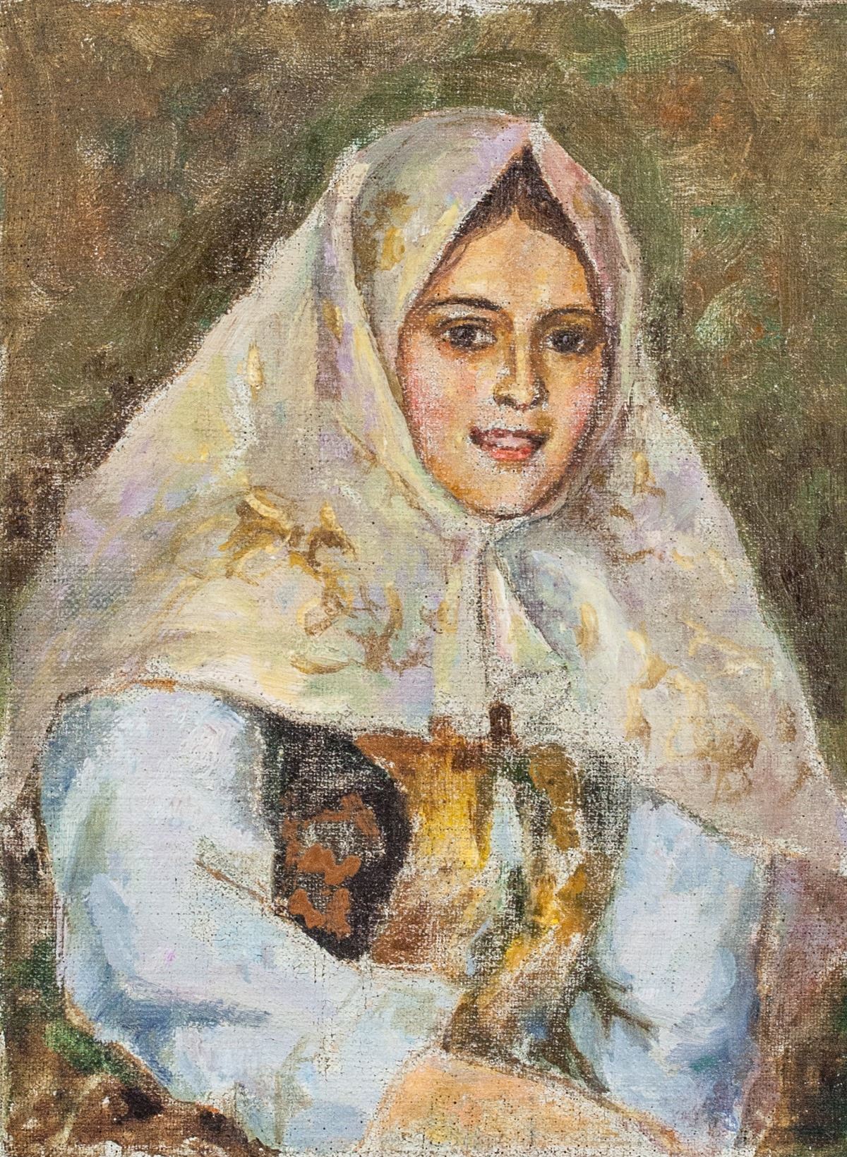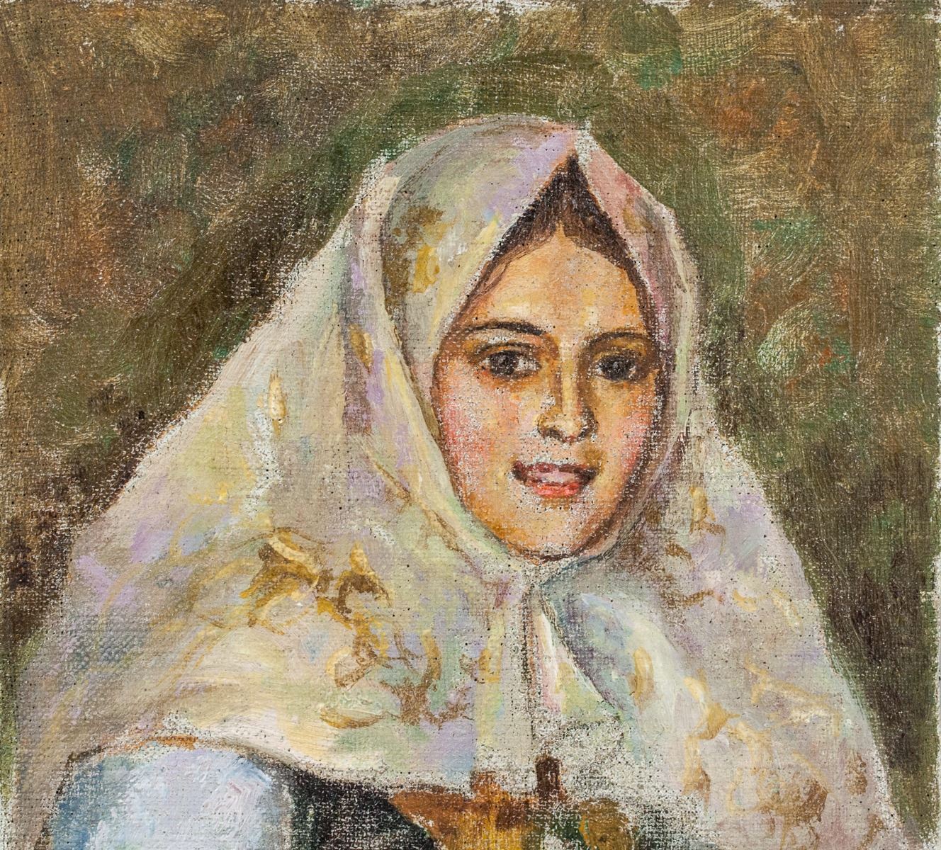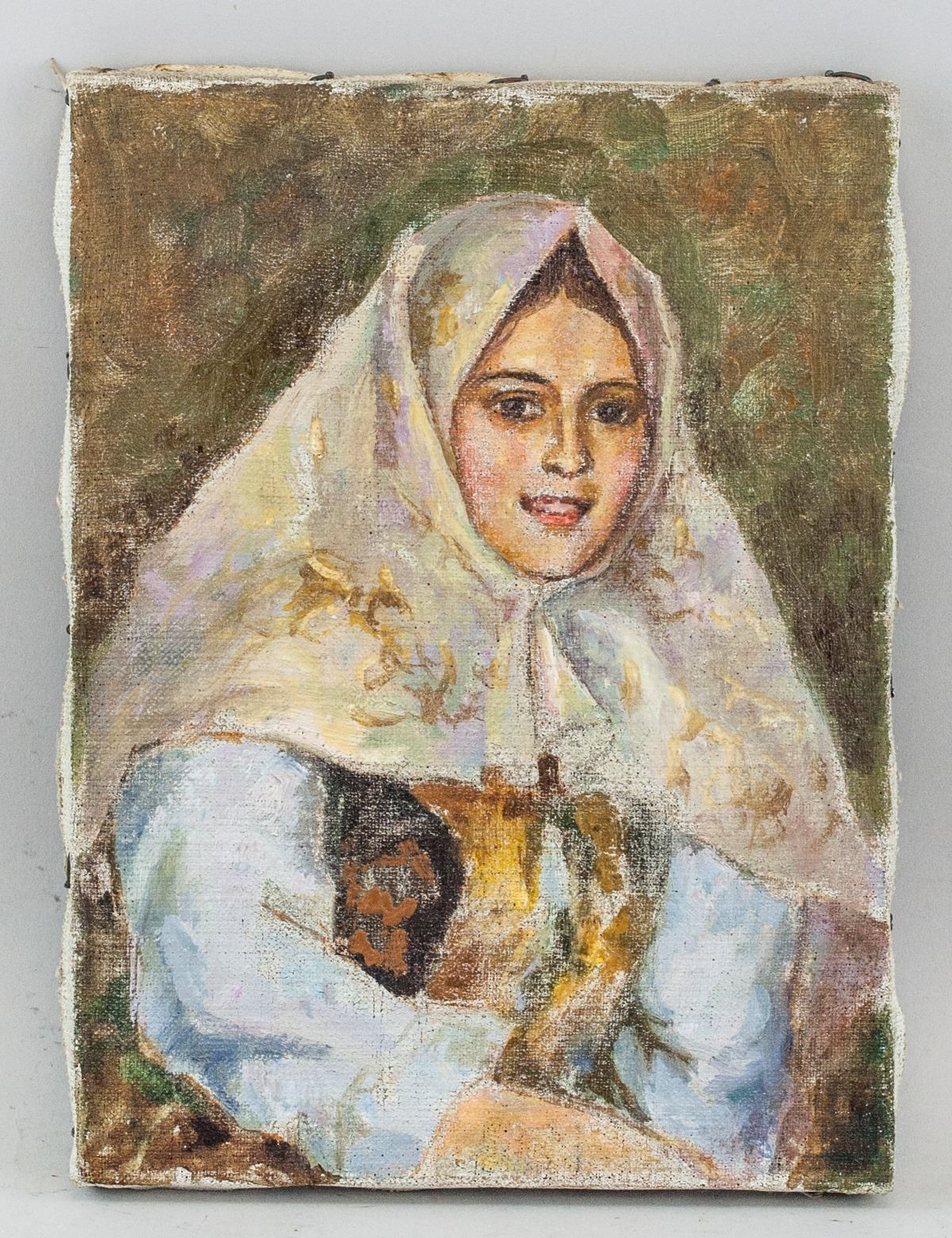 Oil on canvas. Featuring a portrait of a Russian woman. Russian school. Signed on verso illegibly. 29 x 22 cm (11.4 x 8.7 inches). PROVENANCE: Private European collection