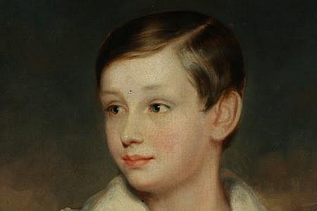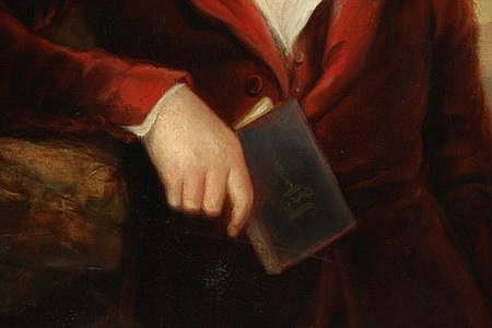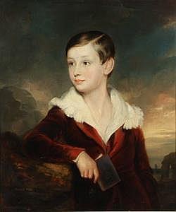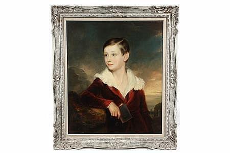 Oil on Canvas - Portrait of Young Boy in Red Velvet Jacket Holding a Book, by Clement Burlison (British, 1815-1894), signed lower left and dated 1843, in later handcarved, pickled frame with cream liner, SS: 29 1/4in x 25 1/4in, OS: 31 1/2in x 36 1/2in