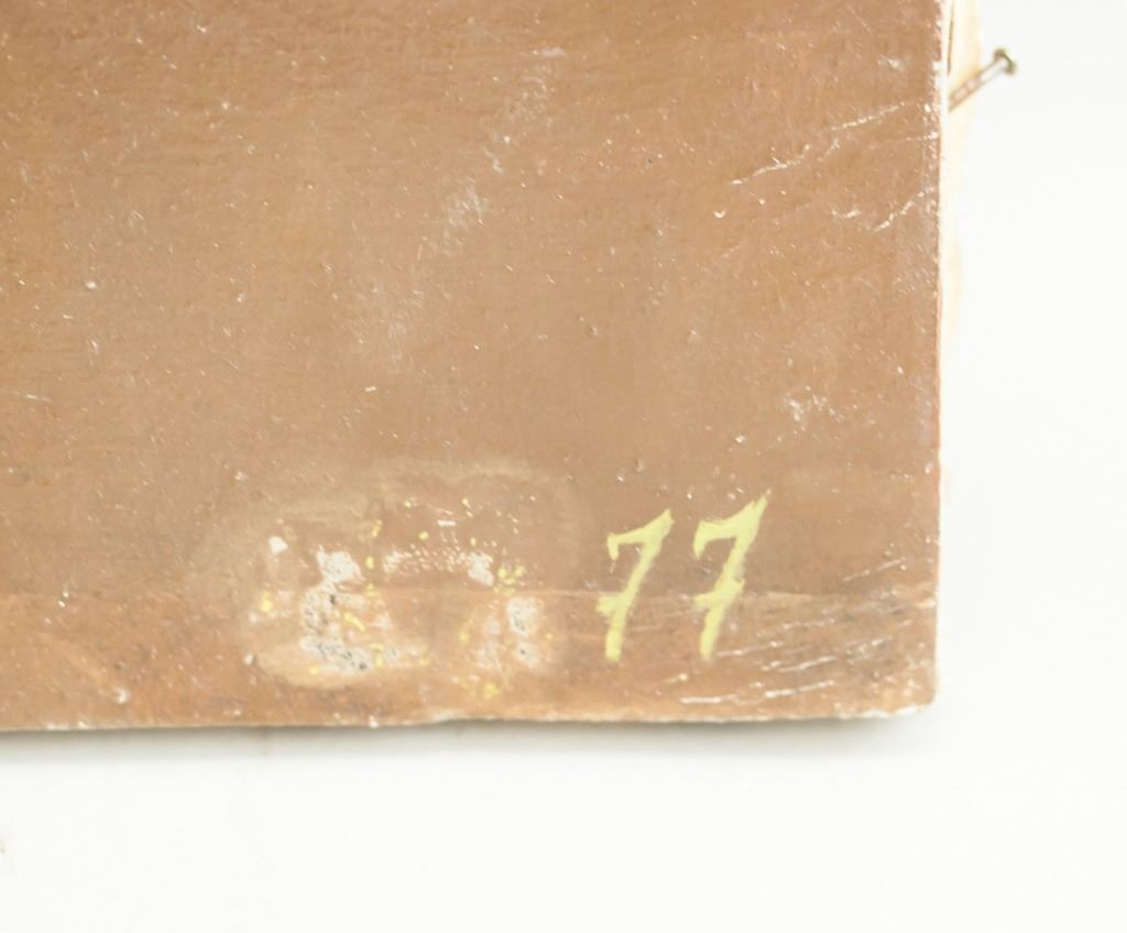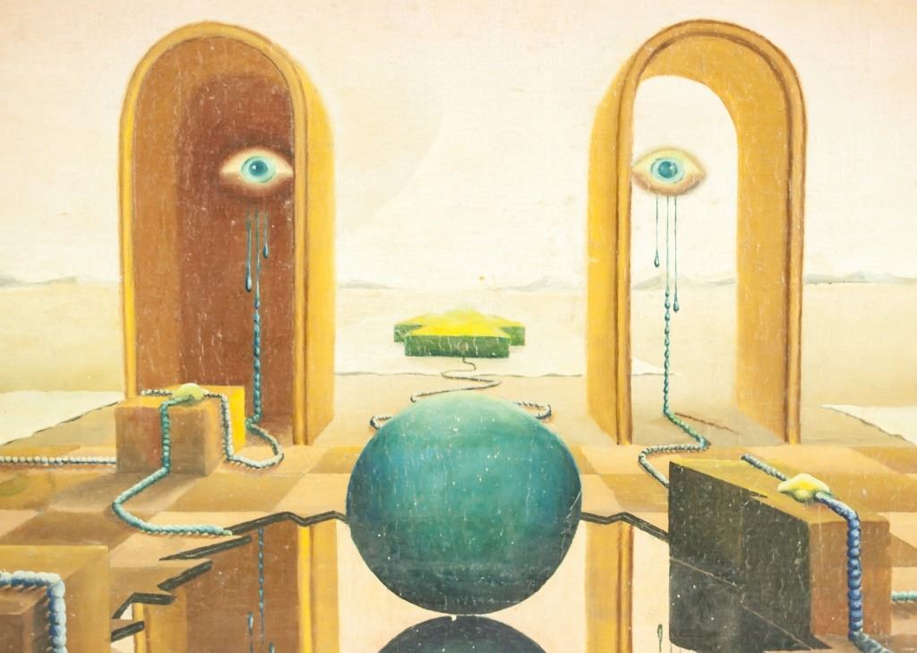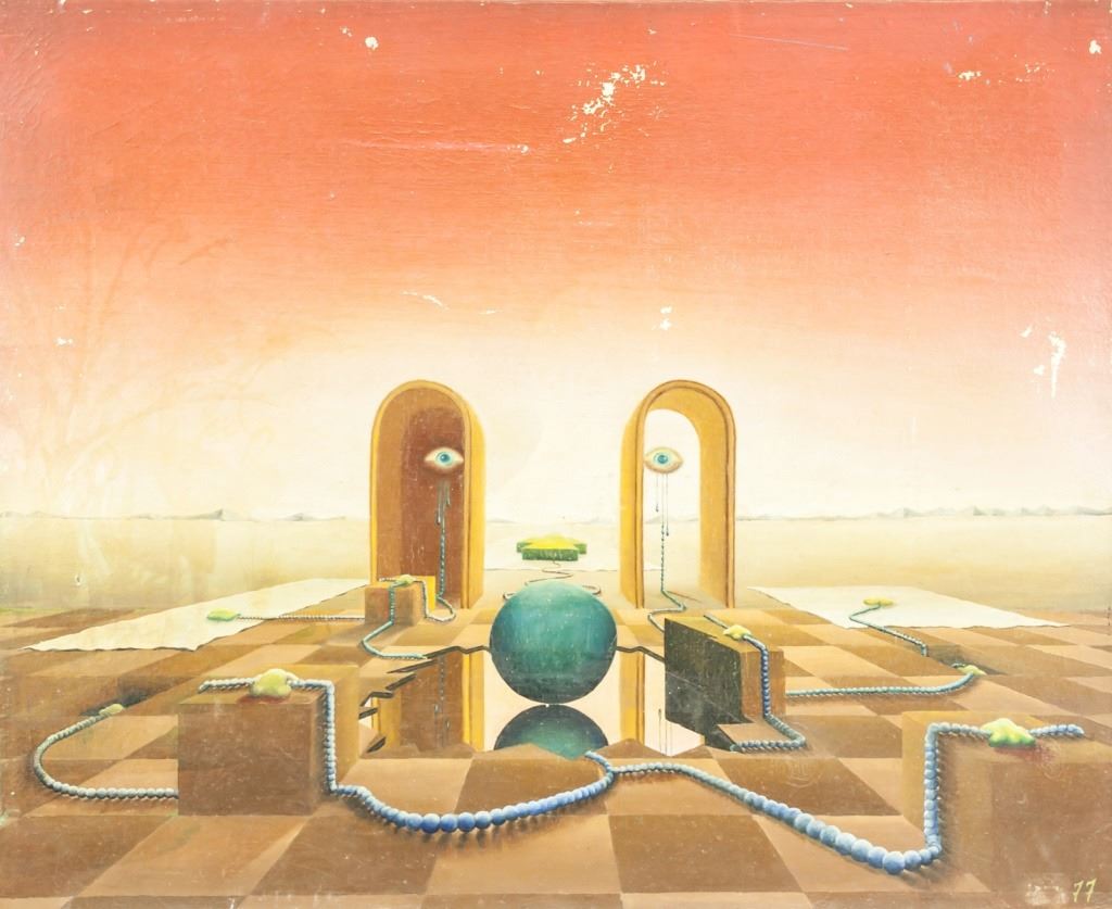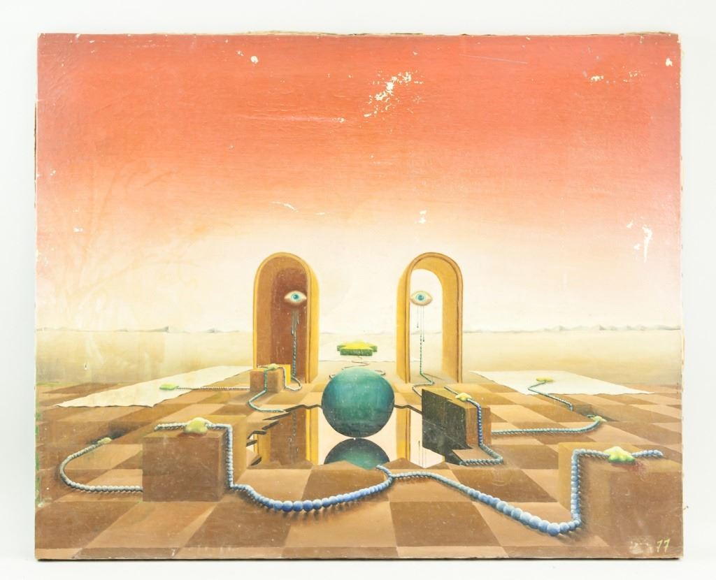 Oil on canvas. Featuring surrealist landscape. Signed "77" to the bottom right corner. Some damage to canvas and oil paint. 61 x 75 cm (24 x 29.5 inches).