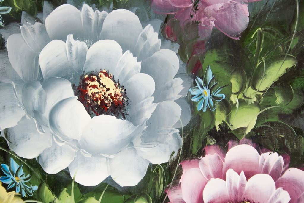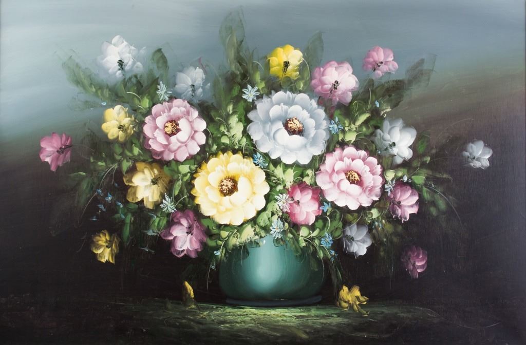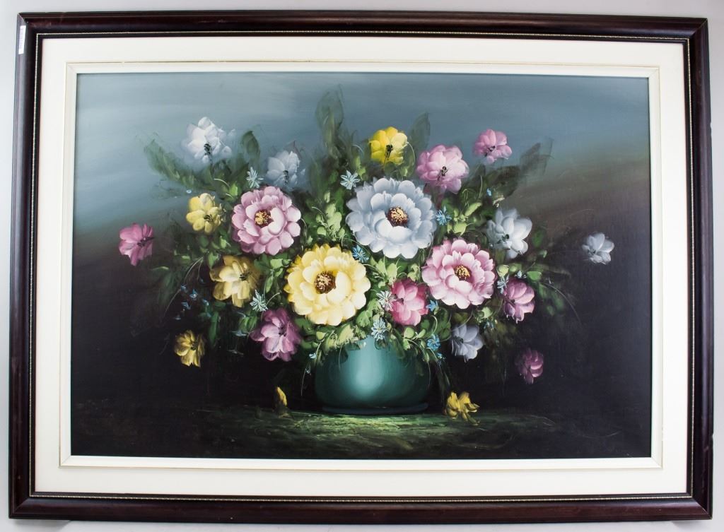 Oil on canvas, framed. Featuring bright bouquet of flowers in a round blue vase. Signed "Annie' to the bottom righ corner. Canvas size: 59.5 x 90 cm (23.25 x 35.5 inches). Frame size: 80 x 112 cm (31.5 x 44 inches).