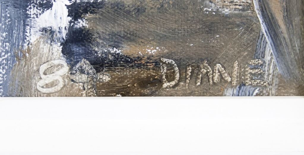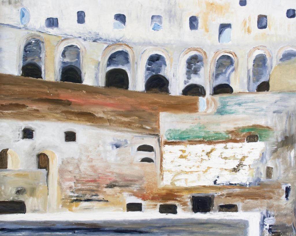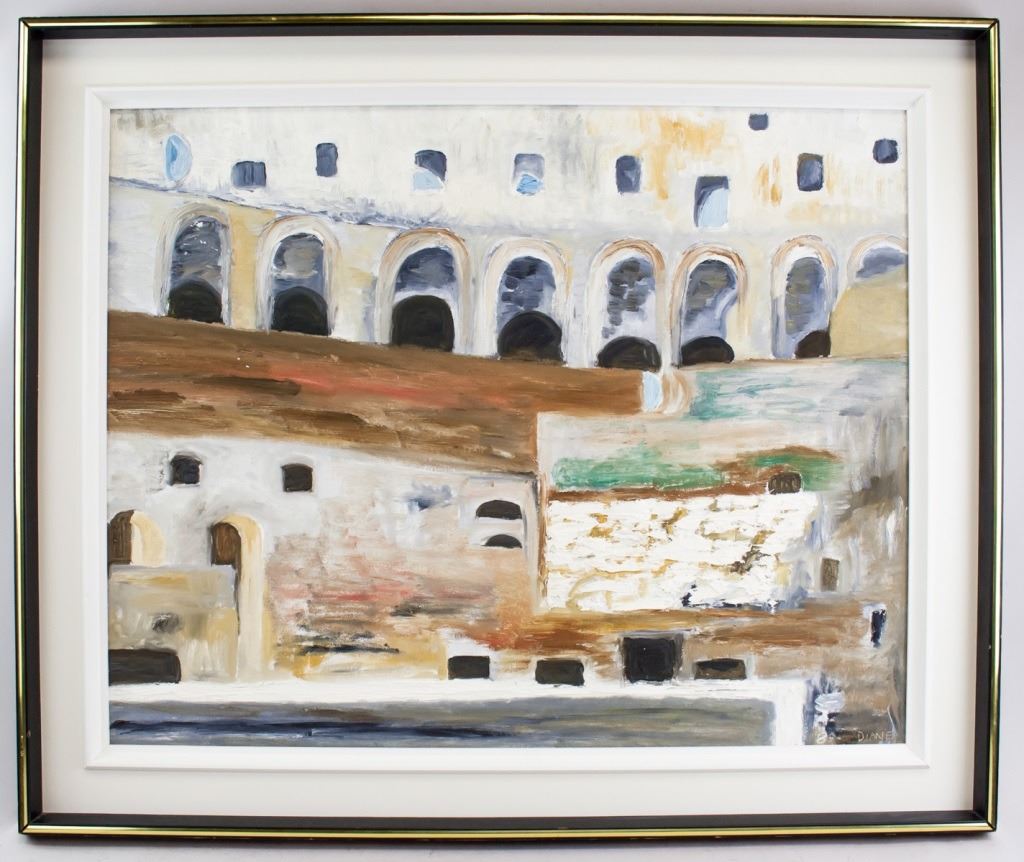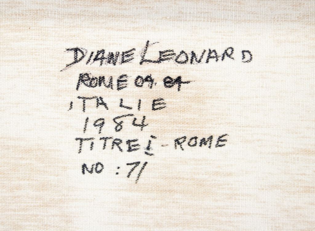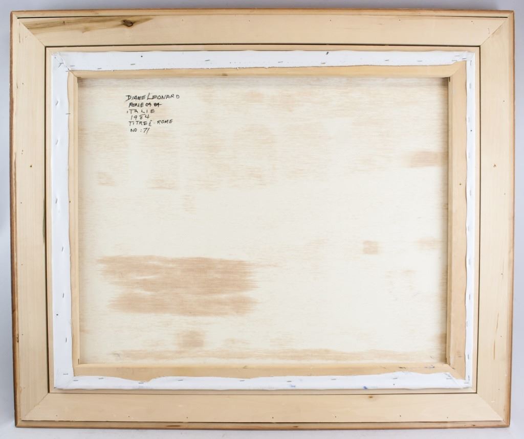 Oil on canvas, framed. Featuring landscape with arches and windows resembling the Colosseum. Signed "Diane" to the bottom right, with '80" inscribed beside the signature. "Diane Leonard Rome 09.84 Italie 1984 Titrei - Rome No: 71" inscribed on verso. Canvas size: 59 x 75 cm (23.25 x 29.5 inches). Frame size: 76 x 92 cm (30 x 36 inches).