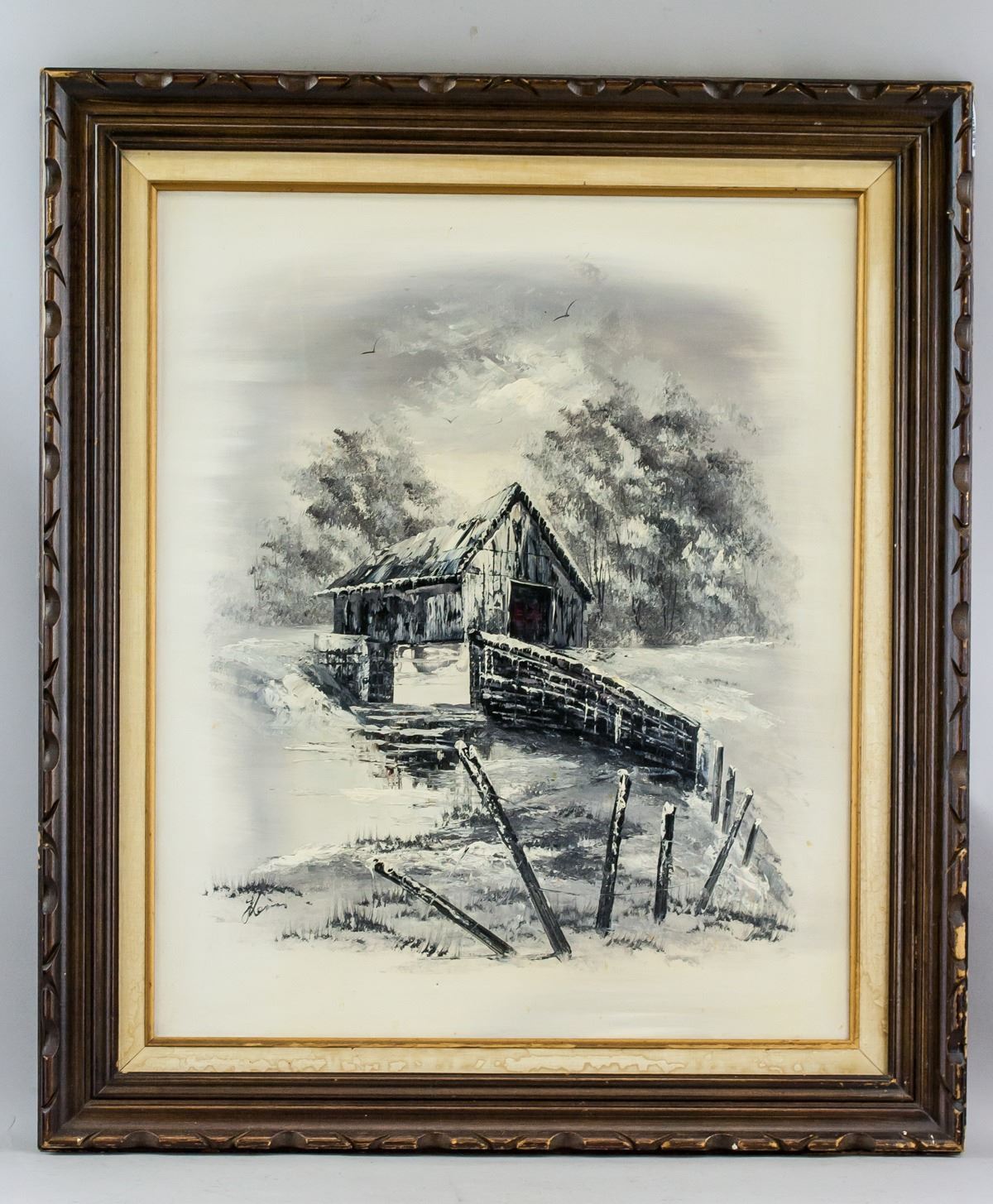 Oil on canvas, stretched and framed. Depicting an old barn near the woods. Signed illegibly in bottom left corner. 60 x 49 cm, Frame: 77 x 64 cm
